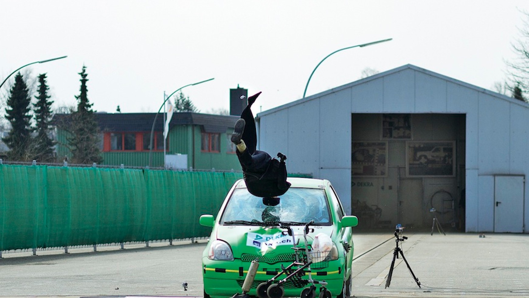 W pierwszej próbie auto jadące z prędkością 50 km/h (a więc dopuszczalną w ruchu miejskim) uderza w specjalnie przygotowanego manekina, wspartego na używanym przez seniorów chodziku. W efekcie manekin jest z ogromną siłą odrzucany o kilka metrów od pojazdu. Rodzaj i stopień obrażeń nie pozostawiają złudzeń – gdyby wypadek wydarzył się naprawdę, starsza osoba nie miałaby dużych szans na przeżycie. Szacuje się, że w Niemczech 2 mln osób porusza się z pomocą takich właśnie urządzeń po miastach, a za 10 lat ich liczba się potroi.
