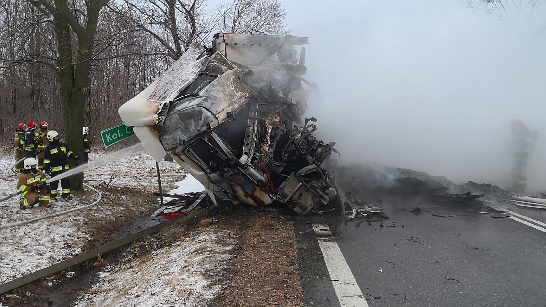 Doszło do zderzenia Scanii i Volvo. Jak się okazało, jeden z zestawów wiózł w chłodniczej naczepie 1000-litrowe zbiorniki, gdzie znajdowała się łatwopalna substancja. Zbiorniki w wyniku wypadku wypadły z naczepy, niszcząc przy okazji ogrodzenie przydrożnej posesji. Jeden z pojazdów zaczął też płonąć.