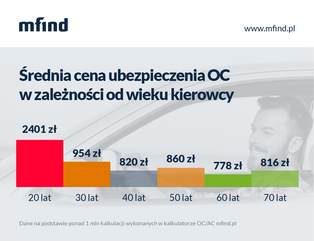 Z danych mfind.pl wynika, że rzeczywiście najmniej płacą sześćdziesięciolatkowie. Jednak z wykresu średnich cen wynika, że kierowcy o 10 lat starsi muszą zapłacić nieco więcej za taką samą polisę. Z kolei najbardziej ryzykowni, wbrew stereotypom, są kierowcy młodzi, a nie starsi. Najwyższe składki zapłacą 20-latkowie – później ceny sukcesywnie spadają, a ich poziom w zależności od wieku osoby wykupującej ubezpieczenie nie zmienia się znacząco. 70-latek zapłaci właściwie tyle samo co osoba 40-letnia, mimo że to on jest traktowany potocznie jako klient „wyższego ryzyka”.