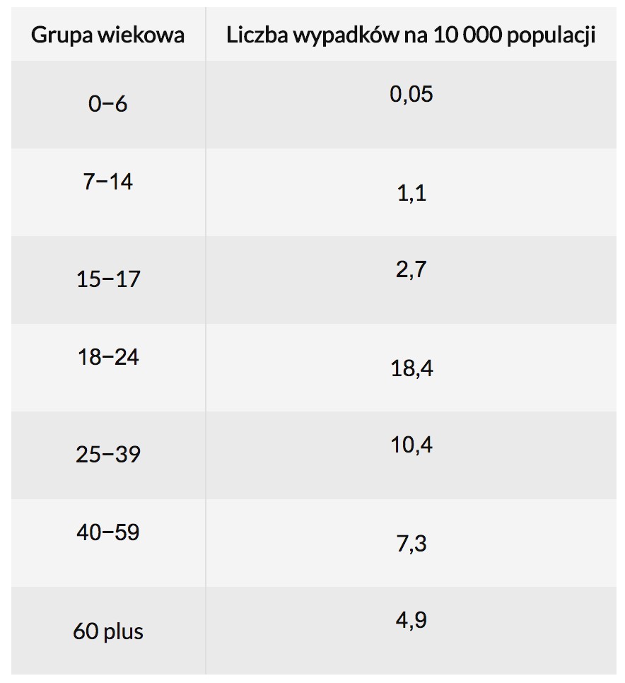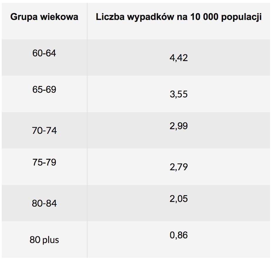 Tu trzeba jednak zauważyć, że grupa 60+ jest bardzo liczna i mocno zróżnicowana. W końcu zdrowego i w pełni sprawnego sześćdziesięciolatka trudno porównywać z osiemdziesięcio- czy dziewięćdziesięciolatkiem. Dlatego też w raporcie ujęto także bardziej szczegółowe statystyki. I te są korzystniejsze dla seniorów, okazuje się bowiem, że im starsi badani, tym mniejszy odsetek wypadków, które powodują. Gdy posłużymy się analogicznym przelicznikiem na 10 tys. osób w danym wieku, liczby wyglądają następująco: