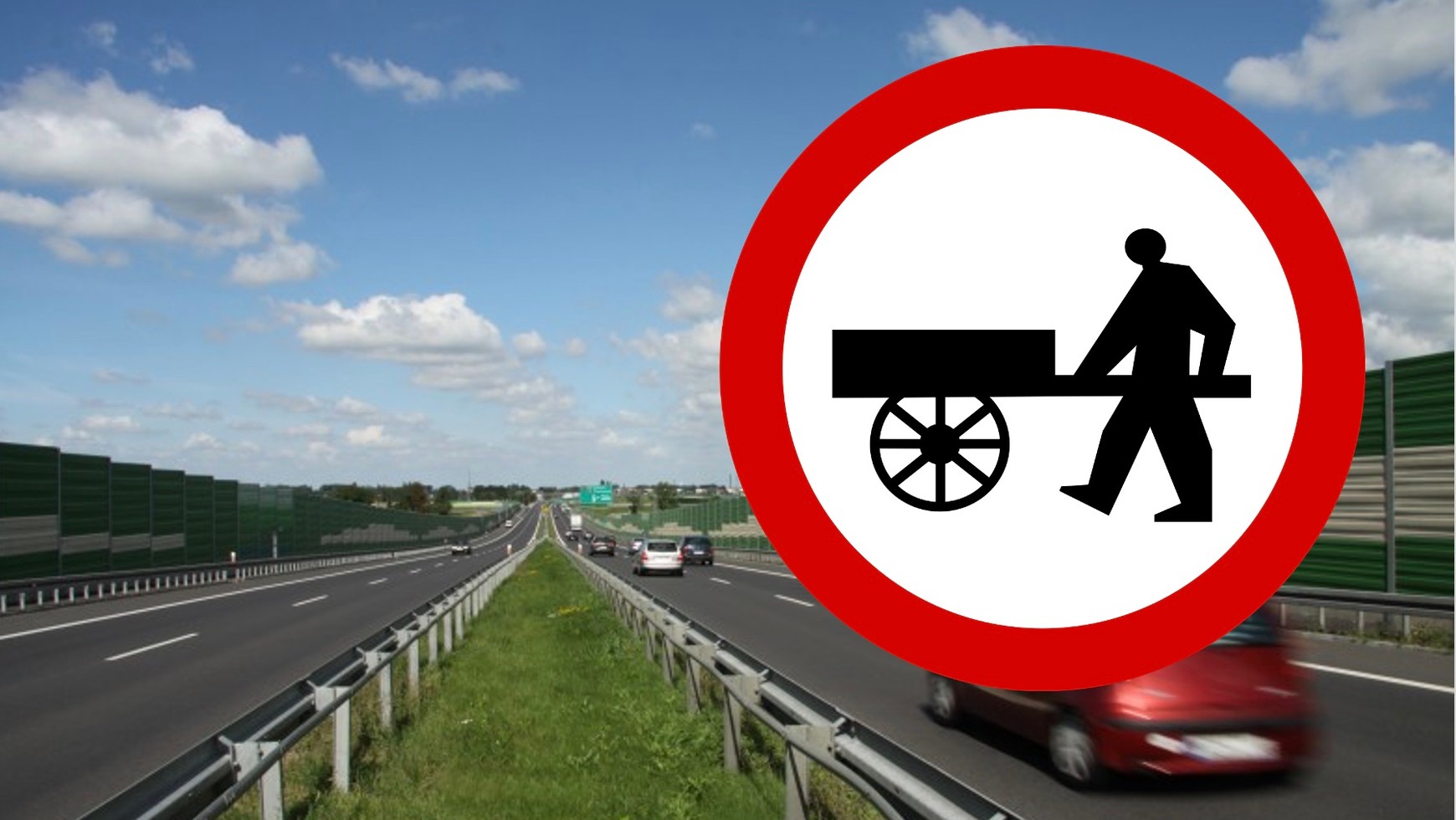 A gdyby ktoś jednak miał jakiś większy ręczny wózek? Jak nim się przemieszczać? Należy przyjąć, że jest się pieszym i poruszać się po chodniku, a gdy go nie ma – po jezdni lub poboczu, ale przy lewej krawędzi drogi. I teoretycznie w takich warunkach natknąć można się na ww. znak. Jednak to już na pewno bardzo rzadka sytuacja.