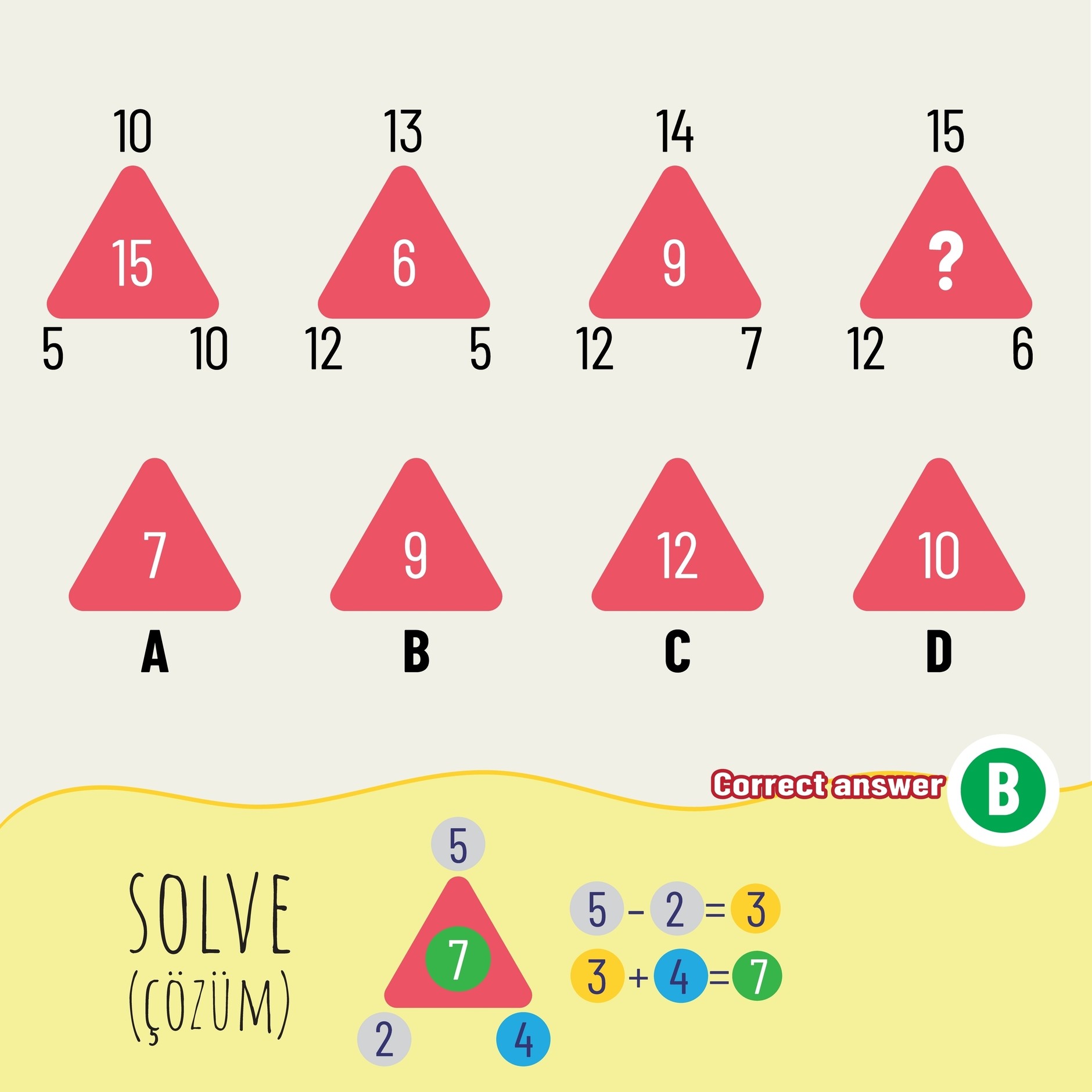 Zgadza się, odpowiedź A jest prawidłowa. Przyjrzyj się dokładnie figurom. W każdym wierszu kolorowe trójkąty przesuwają się według stałego klucza.
