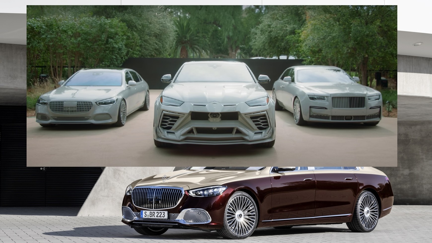 Te samochody, to Rolls-Royce Ghost, Mercedes-Maybach S580 i Lamborghini Urus, a ich kolor jest przygotowany specjalnie pod kolor domu. Widać, że każdy element samochodu, który mógł być polakierowany, jest właśnie w tym kolorze. Celebrytka powiedziała, że jej samochody muszą pasować do barwy domu. Z trójki pokazanych aut Kardashian przyznała, że jej ulubionym samochodem jest Maybach.
