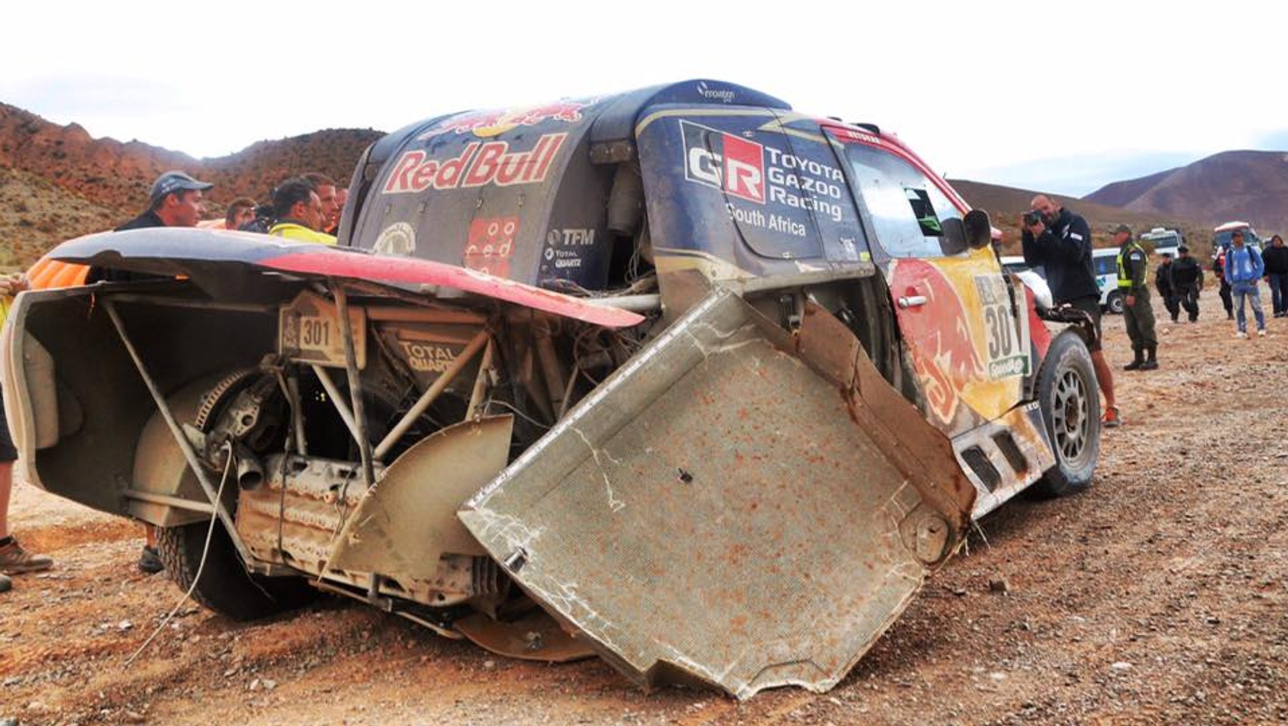 - Koniec gry. To był zły dzień. Mieliśmy pecha. Uderzyliśmy tyłem w dużą skałę, demolując całkowicie koło. Użyliśmy kamieni położonych na masce, by złapać balans na 3 kołach, ale musieliśmy tak jechać przez 80 kilometrów. Zatrzymywaliśmy się, by spróbować naprawy, ale nie była możliwa, bo nie mieliśmy części. Nasze T4 było wciąż bardzo daleko, więc zdecydowaliśmy się jechać dalej aż do mety. Pech, ale tak bywa na rajdach, taki jest Dakar. Wykonaliśmy kawał dobrej roboty, prowadziliśmy, aż tu nagle... Nie wiem, czy uda nam się dalej jechać. Musimy obejrzeć uszkodzenia i zadecydujemy wraz z całym zespołem. Byłoby miło wygrać po raz kolejny Dakar w Toyocie, ale mamy pecha. Czeka nas kolejny długi rok czekania. Ale skoro jesteśmy już w obozie, zobaczymy, co jeszcze możemy zrobić z tym autem. - powiedział na mecie zawiedziony Nasser Al-Attiyah.