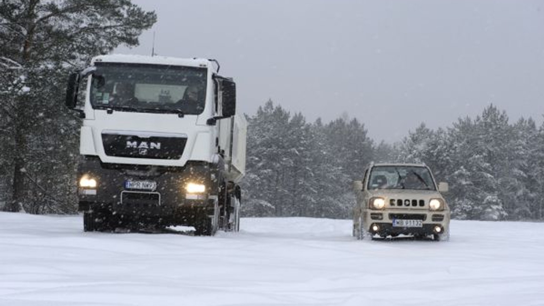 Zaczynam od ciężarówki. Gdyby kabinę zawieszono jeszcze wyżej, musiałbym do niej wjechać windą. W środku atmosfera jak z samochodu osobowego, ciepło, miło... tylko tych 16 biegów, półbiegi, wielkie pokrętło sterujące napędami... doktorat można napisać. Rusza z miejsca ze spokojem, widać, że zawieszenie wchłania nierówności tak skutecznie, że odnoszę wrażenie, iż MAN nie pokonuje dołów i górek poligonu, tylko walcuje je na płasko. Nie da się jednak ukryć faktu, że jest bardzo ciężki. Raz, gdy próbuję ciaśniej skręcić w mieszaninie piachu i rozjeżdżonego śniegu, wywrotka grzęźnie. Szybko wygrzebuję się z pułapki dzięki blokadom mostów. Trzeba pamiętać o masie, podobnie jak o gabarytach, które sprawiają, że jazda leśnym duktem przypomina manewrowanie motorówką w basenie pływackim dla dzieci.