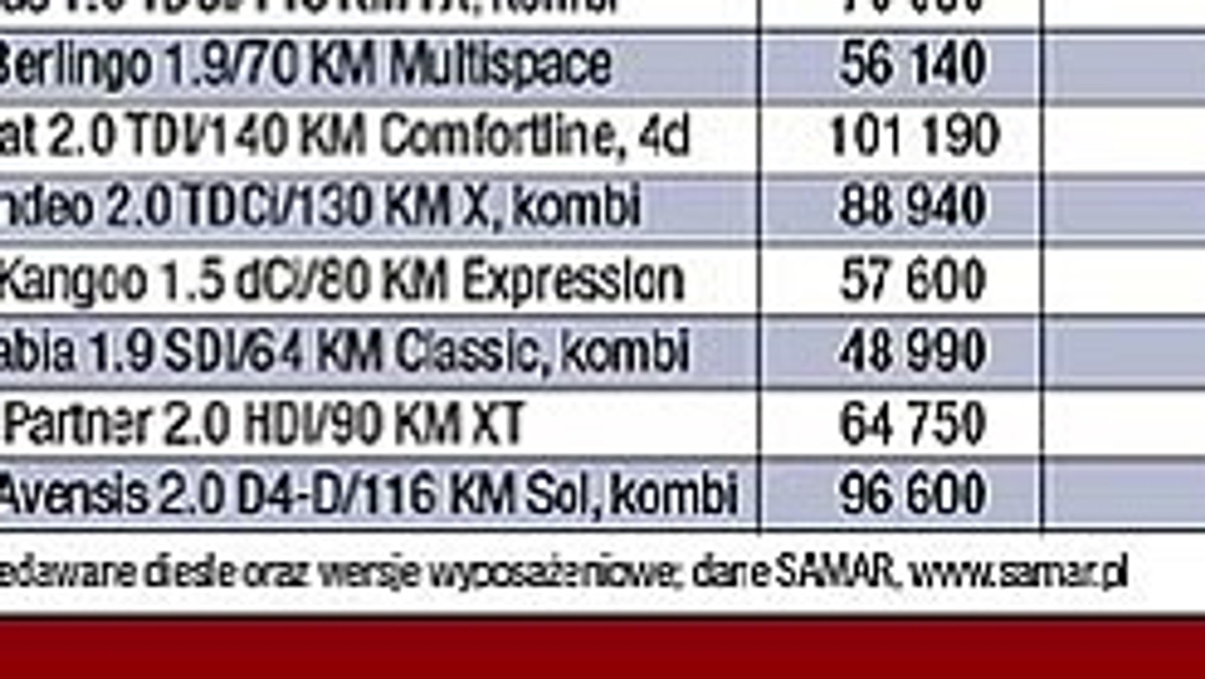 To sporo. Mimo to udział w rynku tych pojazdów wzrósł z 26 do 33 proc. W tym samym czasie zainteresowanie autami benzynowymi spadło z 73,7 do 67 proc. Najwięcej diesli sprzedaje w Polsce Skoda. W 2005 roku było to 10,5 tys. egzemplarzy, co stanowiło udział w sprzedaży 13,5 proc. Na 2 miejscu uplasowała się Toyota (8,6 tys. samochodów, udział 11 proc.). 3 miejsce przypadło Oplowi - 7,5 tys., 9,7-proc. udział w rynku. Kolejne miejsca zajęły firmy: Ford, Renault, Volkswagen, Peugeot, CitroĎn, Fiat oraz Nissan.Rosnący udział diesli w rynku powoduje, że producenci są dość wstrzemięźliwi w udzielaniu rabatów. Więcej można zyskać, decydując się na zakup auta z roku 2005. Najwięcej ma do zaoferowania CitroĎn - Berlingo przeceniono aż o 13 tys. zł. Równie dużo można zaoszczędzić, kupując VW Passata, Forda Mondeo oraz Renault Kangoo. Skoda Octavia oprócz rabatu gotówkowego oferuje również kredyt 50/50 z preferencyjnym ubezpieczeniem, leasingiem i czujnikami parkowania. Więcej: http://www.samar.pl