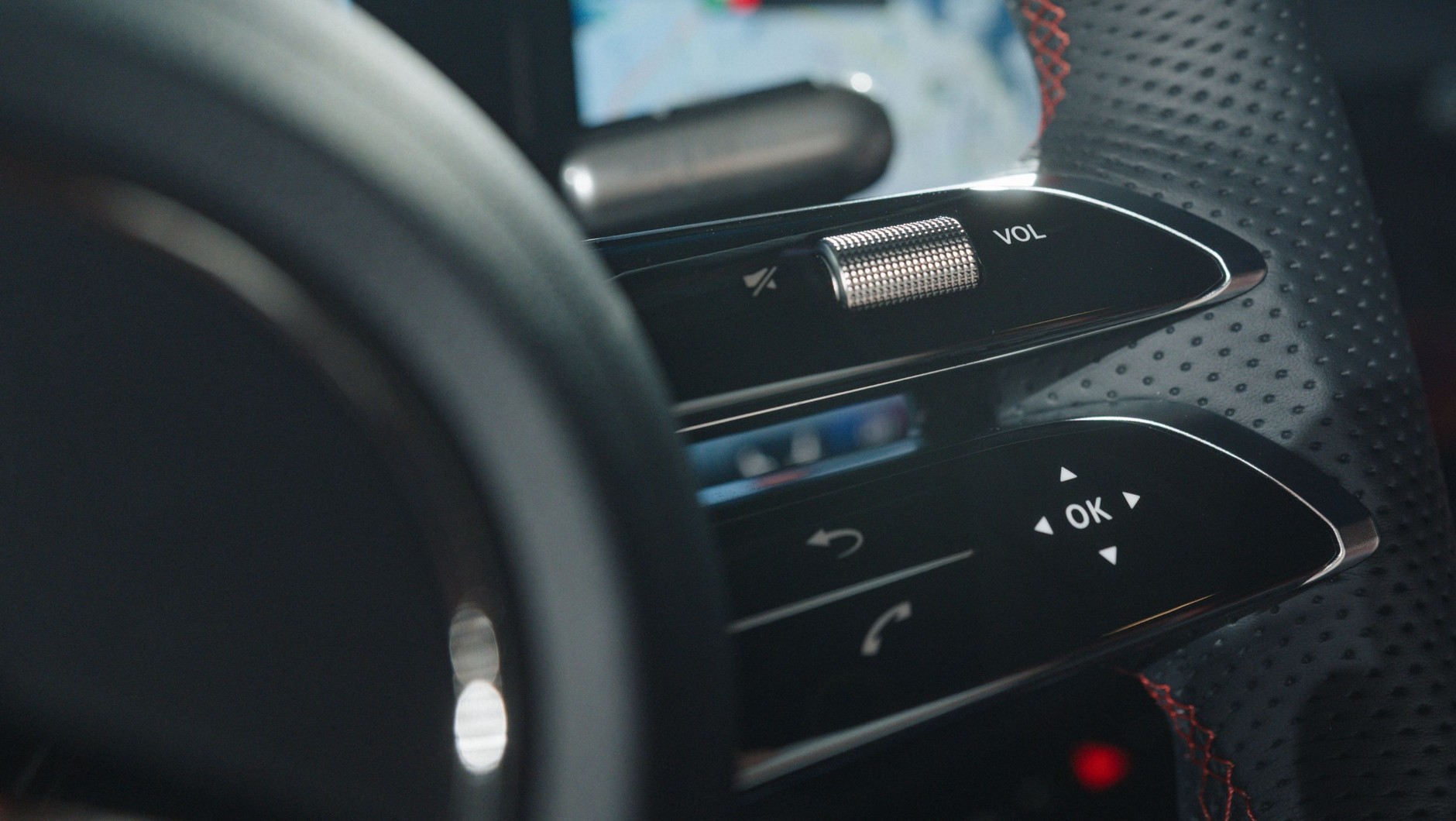 Zaczyna się skromnie: w górnych ramionach kierownicy nowych generacji Mercedesa GLC i CLA Shooting Brake znalazły się przełącznik (w lewym ramieniu) i pokrętło (w prawym). Ten nowy wzór kierownicy relatywnie szybko trafi do reszty samochodów Mercedesa.