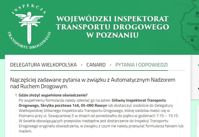 List z zawiadomieniem o czynnościach wyjaśniających w sprawie wykroczenia ujawnionego urządzeniem rejestrującym, nadany ze skrzynki pocztowej 146 w Raszynie, jest prawdziwy. To prawdziwa skrzynka pocztowa, której używa GITD, którego siedziba mieści się na Al. Jerozolimskich 94 w Warszawie. Taki właśnie adres kontaktowy, służący również do przesyłania do GITD dokumentacji potwierdzającej zbycie pojazdu, można znaleźć na stronie CANARD-u czy Wojewódzkiego Inspektoratu Transportu Drogowego w Poznaniu, gdzie również podawany jest taki adres do składania wypełnionych oświadczeń związanych z Automatycznym Nadzorem nad Ruchem Drogowym.