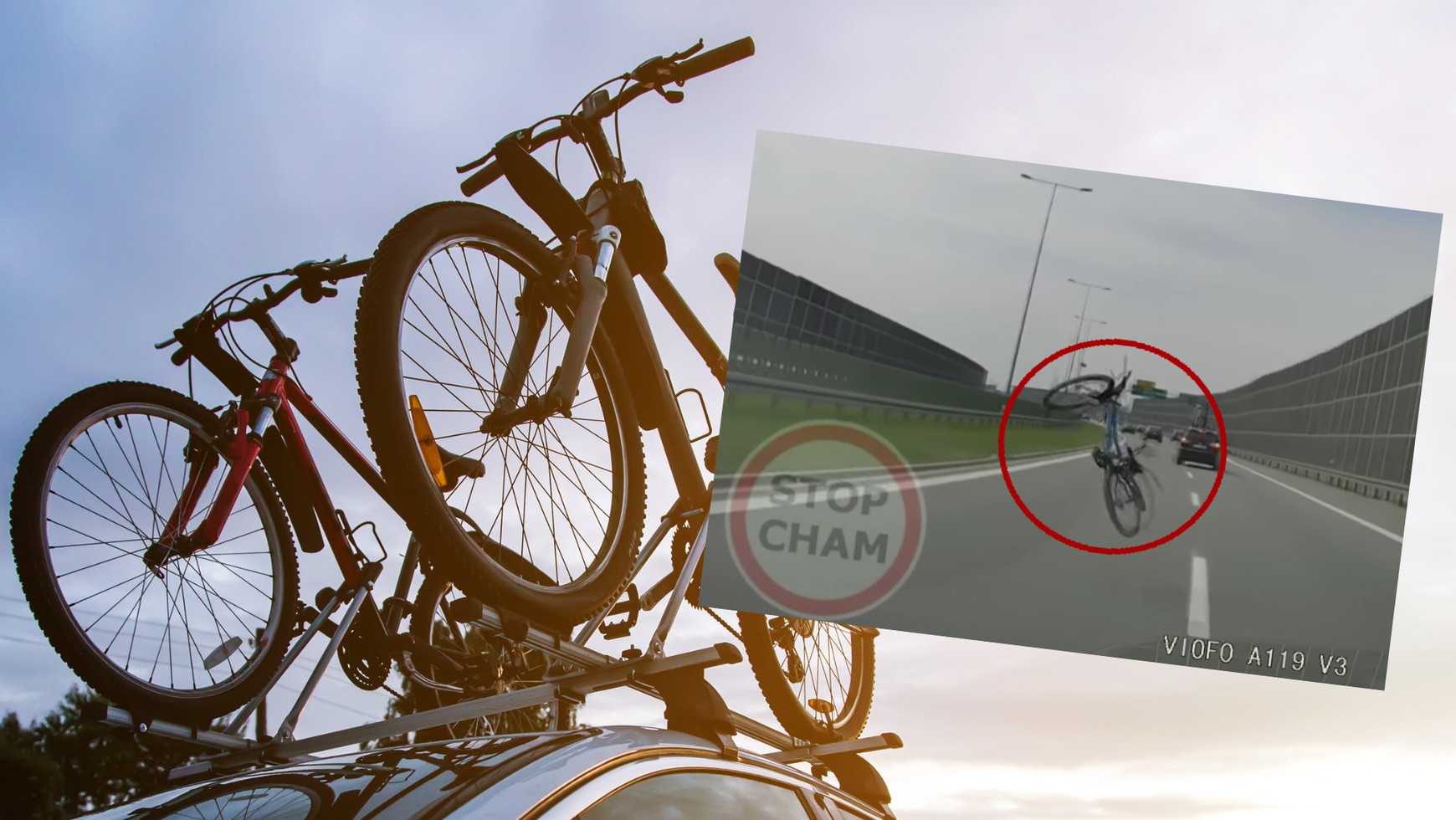 Popularny kanał pokazujący wybryki kierowców na polskich drogach "Stop Cham" opublikował nagranie, które poruszyło internautów. Widać na nim, jak przy prędkości ok. 120 km na godz. rower wypada z bagażnika, znajdującego się na dachu auta, po czym spada na jezdnię.