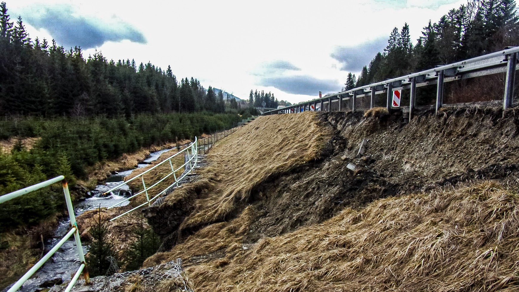 Obecny stan drogi jest m.in. efektem występujących ostatnio niekorzystnych warunków pogodowych. Opady deszczu i dodatnie temperatury przyspieszające roztopy spowodowały nasiąknięcie gruntu i korpusu drogowego. To z kolei doprowadziło do utraty stateczności tych konstrukcji i osunięcia muru oporowego z koszy siatkowo-kamiennych oraz krawędzi jezdni. Drogowcy doraźnie zabezpieczyli uszkodzone miejsce i w trybie awaryjnym wprowadzili na tym odcinku ruch wahadłowy, co pozwoliło odciążyć jezdnię i do maksimum odsunąć ruch samochodów od uszkodzonej krawędzi jezdni.