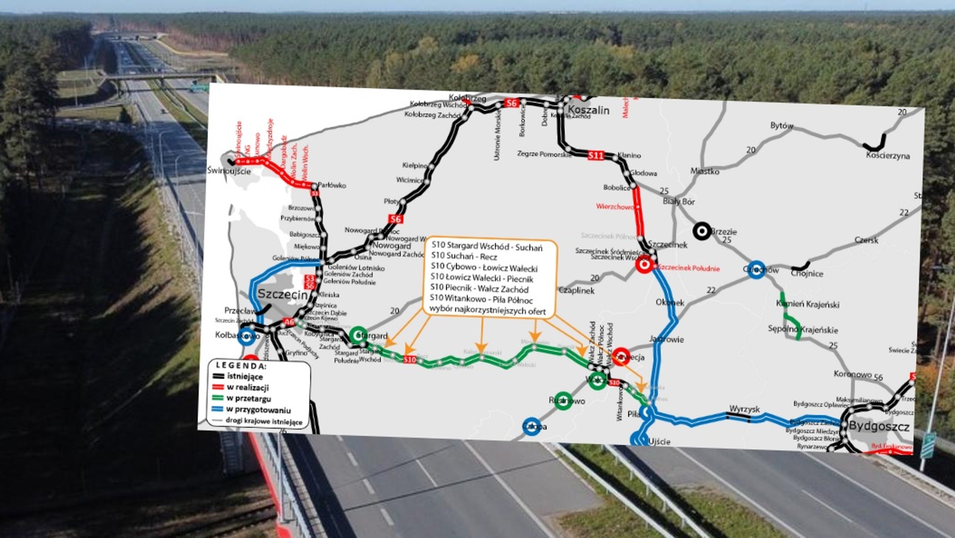 W okresie dwóch tygodni na przełomie września i października 2023 r. Generalna Dyrekcja Dróg Krajowych i Autostrad (GDDKiA) sukcesywnie ogłaszała postępowania na wyłonienie wykonawców ośmiu fragmentów, na które została podzielona budowa drogi ekspresowej S10 pomiędzy Szczecinem i Piłą.