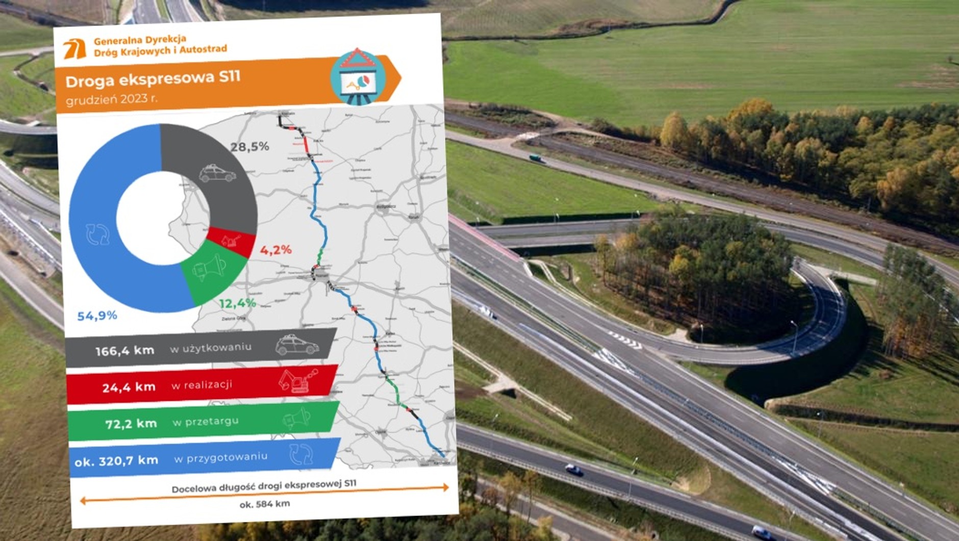 Pozostałe odcinki, w zależności od etapu, są już na etapie realizacji lub przygotowań. Gdy droga S11 będzie gotowa już w całości, przejazd z Kołobrzegu do węzła Piekary Śląskie na połączeniu z autostradą A1 zajmie autem osobowym nieco ponad pięć godzin.