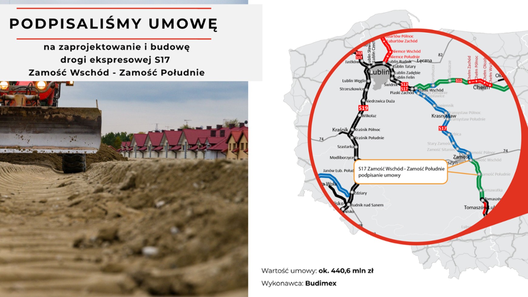 Dzięki podpisaniu umowy na projekt i budowę drogi S17 Zamość Wschód — Zamość Południe rozpoczyna się realizacja fragmentu ekspresówki na południe od Zamościa. Generalna Dyrekcja Dróg Krajowych i Autostrad (GDDKiA) przekazała, że w ramach inwestycji powstanie ok. 12,5 km drogi o przekroju dwujezdniowym z dwoma pasami ruchu w obu kierunkach oraz pasami awaryjnymi. Dodatkowo powstaną obiekty inżynierskie, m.in. most i dziewięć wiaduktów, a także drogi do obsługi ruchu lokalnego.
