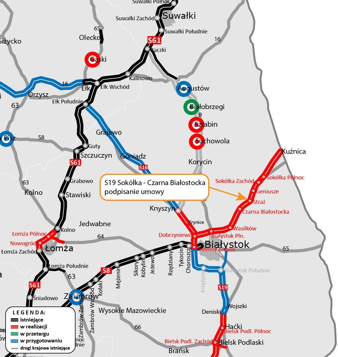 Po podpisaniu umowy na budowę odcinka S19 Sokółka – Czarna Białostocka, realizacja drogi ekspresowej S19 w woj. podlaskim wygląda następująco: