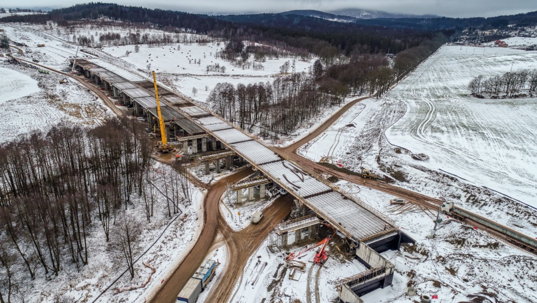 Obecnie na budowie trwają intensywne prace na drodze S3 – pracuje tam niemal 200 jednostek sprzętowych i prawie 950 osób. Roboty ziemne prowadzone są przy wykopach w gruntach skalistych oraz nieskalistych. W maju 2021 r. rozpoczęto też jeden z bardziej skomplikowanych etapów budowy – nasuwanie pięciu obiektów inżynierskich. Ich długości wynoszą od 435 do prawie 600 m. Łączna długość wiaduktów wynosi niemal 4,5 km, co stanowi ok. 29 proc. całej realizowanej trasy. Cztery obiekty zostały już nasunięte, a ostatni, przy sprzyjających warunkach atmosferycznych, wykonawca zakończy na początku lutego 2022 r.