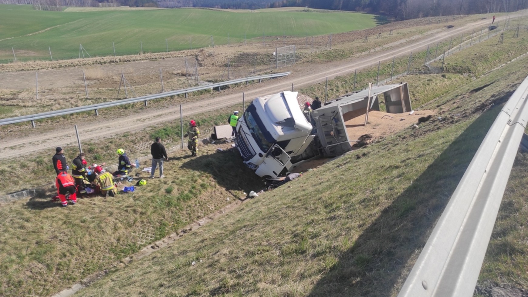 We wtorek (19 kwietnia) przed południem na drodze S7 w pobliżu miejscowości Rychnowo doszło do wypadku. Z kilkumetrowego nasypu do rowu zjechał ciągnik siodłowy z naczepą, na której znajdował się transport zboża. W ciężarówce znajdował się wyłącznie kierowca.