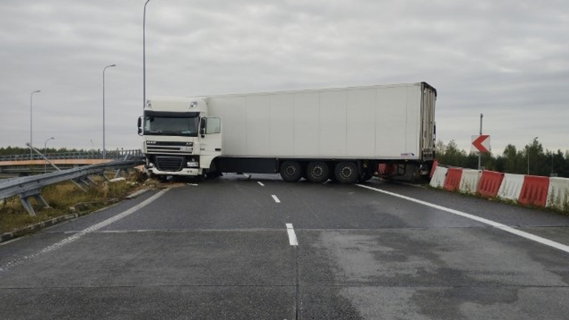 Generalna Dyrekcja Dróg Krajowych i Autostrad (GDDKiA) poinformowała, że kierowcy jadący drogą ekspresową S8 oraz autostradą A1 muszą liczyć się z utrudnieniami w ruchu. Na pierwszej z tras na węźle Łódź Południe na łącznicy na kierunku Wrocław — Gdańsk ciężarówka wpadła w poślizg i po uderzeniu w bariery zablokowała całą jezdnię.