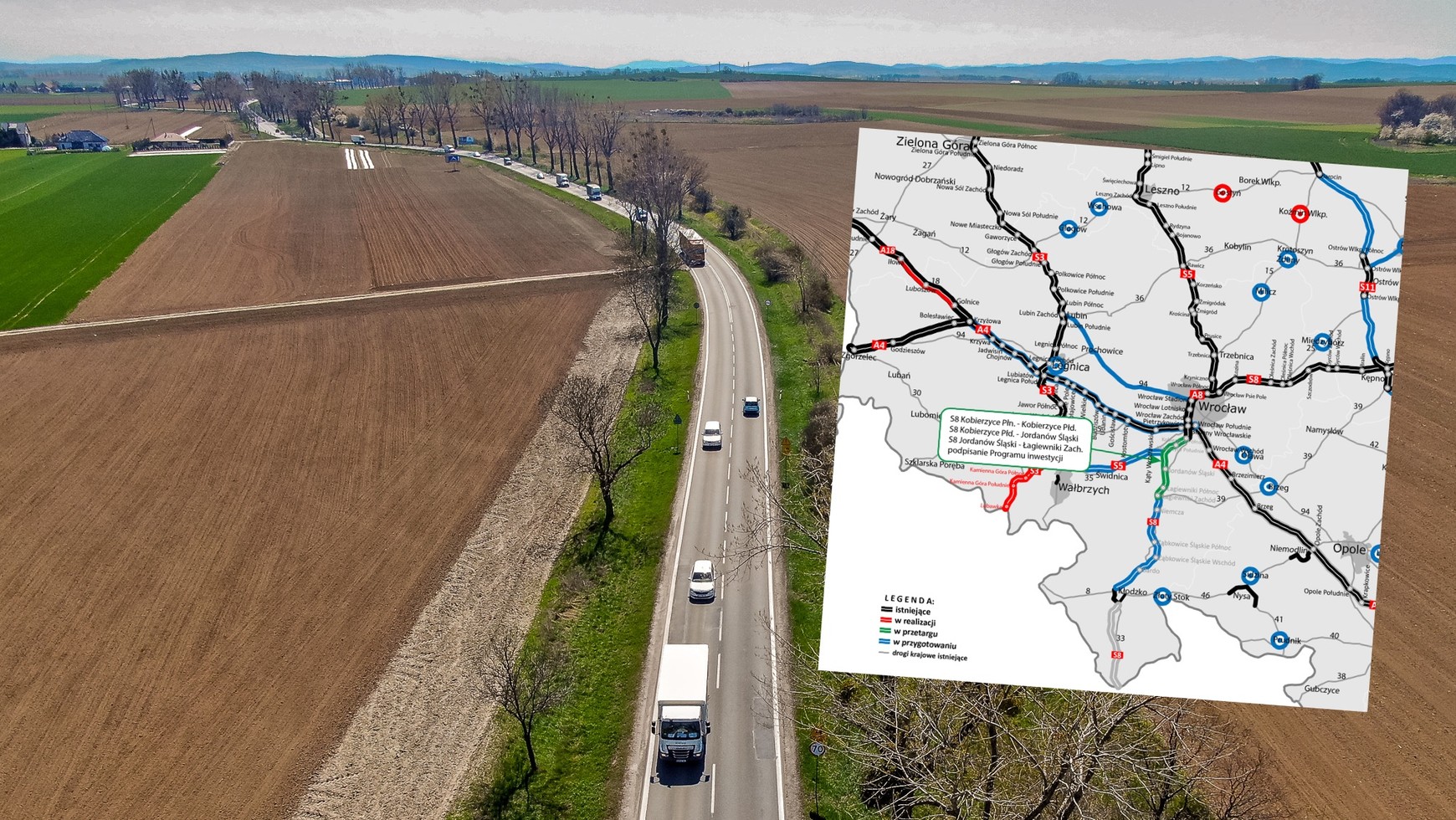 Już wkrótce Generalna Dyrekcja Dróg Krajowych i Autostrad (GDDKiA) ogłosi przetarg na projekt i budowę trzech odcinków realizacyjnych pomiędzy Kobierzycami i Łagiewnikami. Będą to Kobierzyce Północ — Kobierzyce Południe (długość ok. 7,5 km), Kobierzyce Południe — Jordanów Śląski (długość ok. 13,8 km) i Jordanów Śląski — Łagiewniki Zachód (długość ok. 11,2 km). Cały 32,5-kilometrowy fragment będzie częścią drogi ekspresowej S8 o długości 87 km, która połączy Wrocław i Kłodzko.