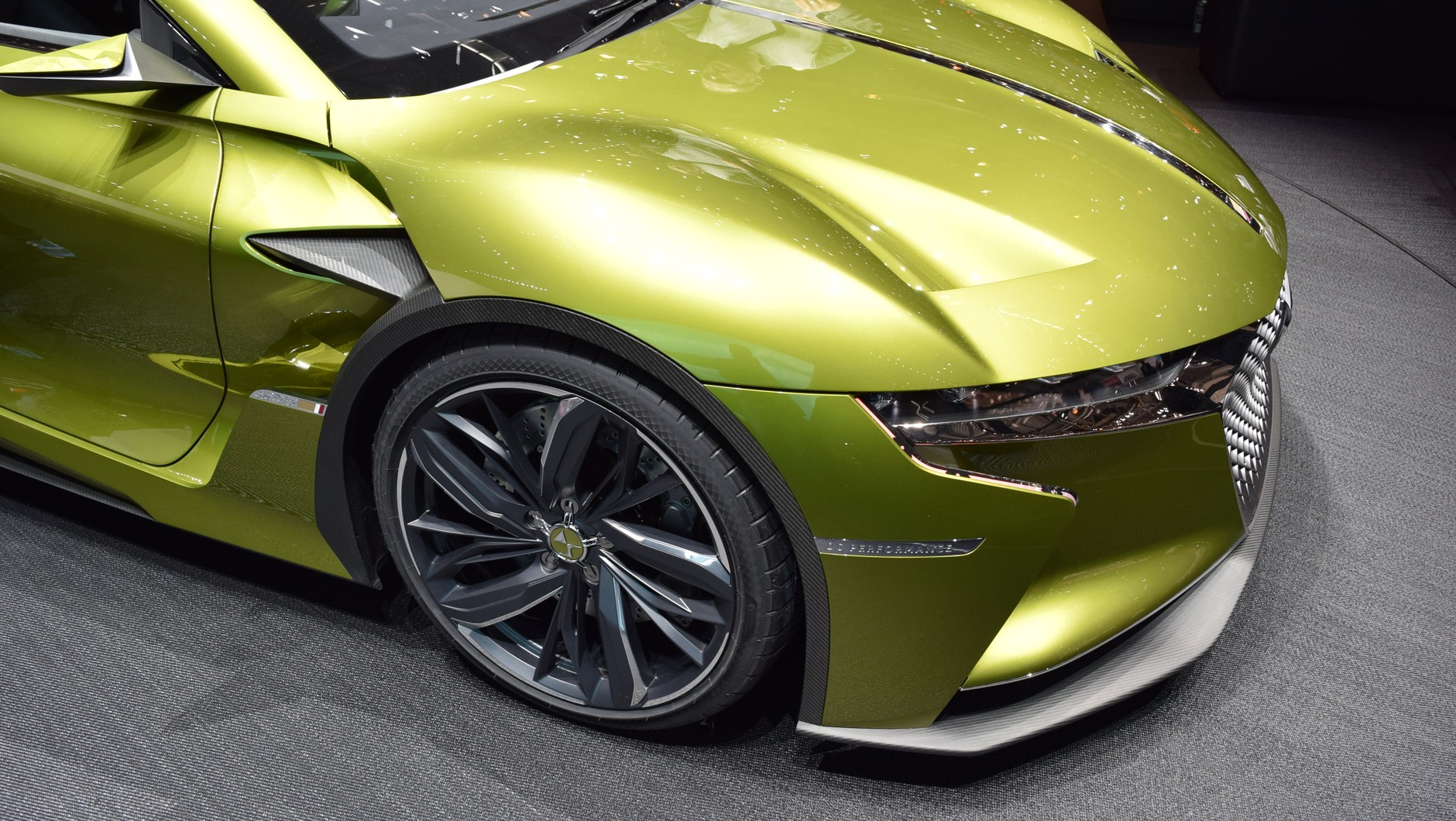 Projektanci zainspirowali się innym konceptem DS Divine, który zadebiutował podczas salonu samochodowego w Paryżu w 2014 roku i podobnie do niego E-Tense nie posiada tylnej szyby. Inspiracje na tym się nie kończą. Tylne kierunkowskazy projektanci podpatrzyli w modelu DS z roku 1955. Pojazd otrzymał również 20-calowe obręcze, na które nałożono opony Michelin Pilot Super Sport.