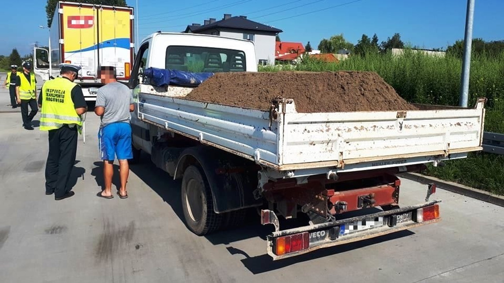 Skrzyniowy „dostawczak” marki Iveco przewoził tzw. suchy beton. Kierowca nie tylko znacznie przekroczył dopuszczalną masę całkowitą auta, które prowadził, ale też nie zabezpieczył ładunku zgodnie z przepisami – wymagana jest bowiem plandeka, która zabezpiecza beton przed wysypywaniem się na drogę.