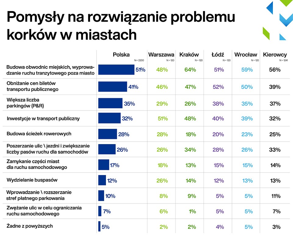 Z badań agencji Research Collective wynika, że aż 77 proc. kierowców poruszających się po dużych miastach w Polsce często doświadcza stania w korkach. Według badanych najlepszym sposobem na upłynnienie ruchu w takich obszarach byłoby wytyczenie nowych obwodnic (51 proc.), ale dużo osób widziałoby też nowe parkingi Park&Ride (35 proc.) i poszerzone ulice (26 proc.).