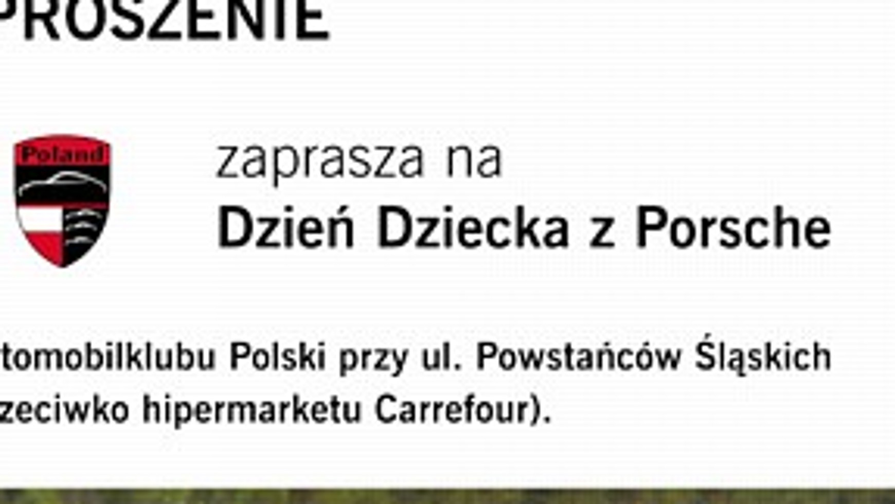 W Legionowie klub Porsche będzie gościć dzieci z Domu Dziecka W Chotomowie, a dnia następnegona Bemowie klub będzie kwestować na wspomniany Dom Dziecka - każdy datek umożliwiprzejechanie się Porsche! Oczywiście w/w imprezom towarzyszyć będzie rywalizacja członków kluby w próbach sportowych którym będzie można kibicować.Widzów zapraszmy w niedzielę1 czerwca na Autodrom A.P. na Bemowie , oto atrakcje jak przygotowano dla najmłodszych:możliwość przejażdżki samochodami Porsche po "płycie Kubicy", plac zabaw dla dzieci próby sportowe Porsche Club