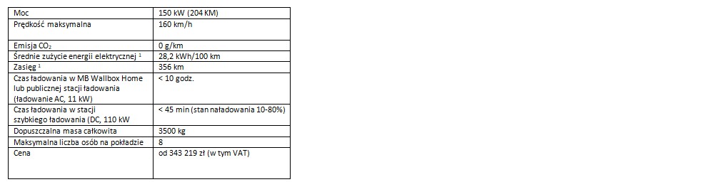 Elektryczny van Mercedesa debiutuje z długim rozstawem osi i dopuszczalną masą całkowitą 3500 kg. Silnik o maksymalnej mocy 150 kW (204 KM) pozwala rozwinąć prędkość do 160 km/h, co umożliwia żwawe poruszanie się po trasach poza miastem. Maksymalny moment obrotowy wynosi do 362 Nm. Od lipca EQV jest dostępne w Polsce – w cenie już 343 219 zł (w tym 23% VAT) z kablem do ładowania w standardzie, a w ramach promocji specjalnej pierwsi klienci wraz z samochodem otrzymają ładowarkę MB Wallbox Home za 1 zł. EQV można oczywiście naładować też za pomocą zwykłego gniazdka – jednak dzięki ładowarce naściennej odzyska energię trzy razy szybciej.