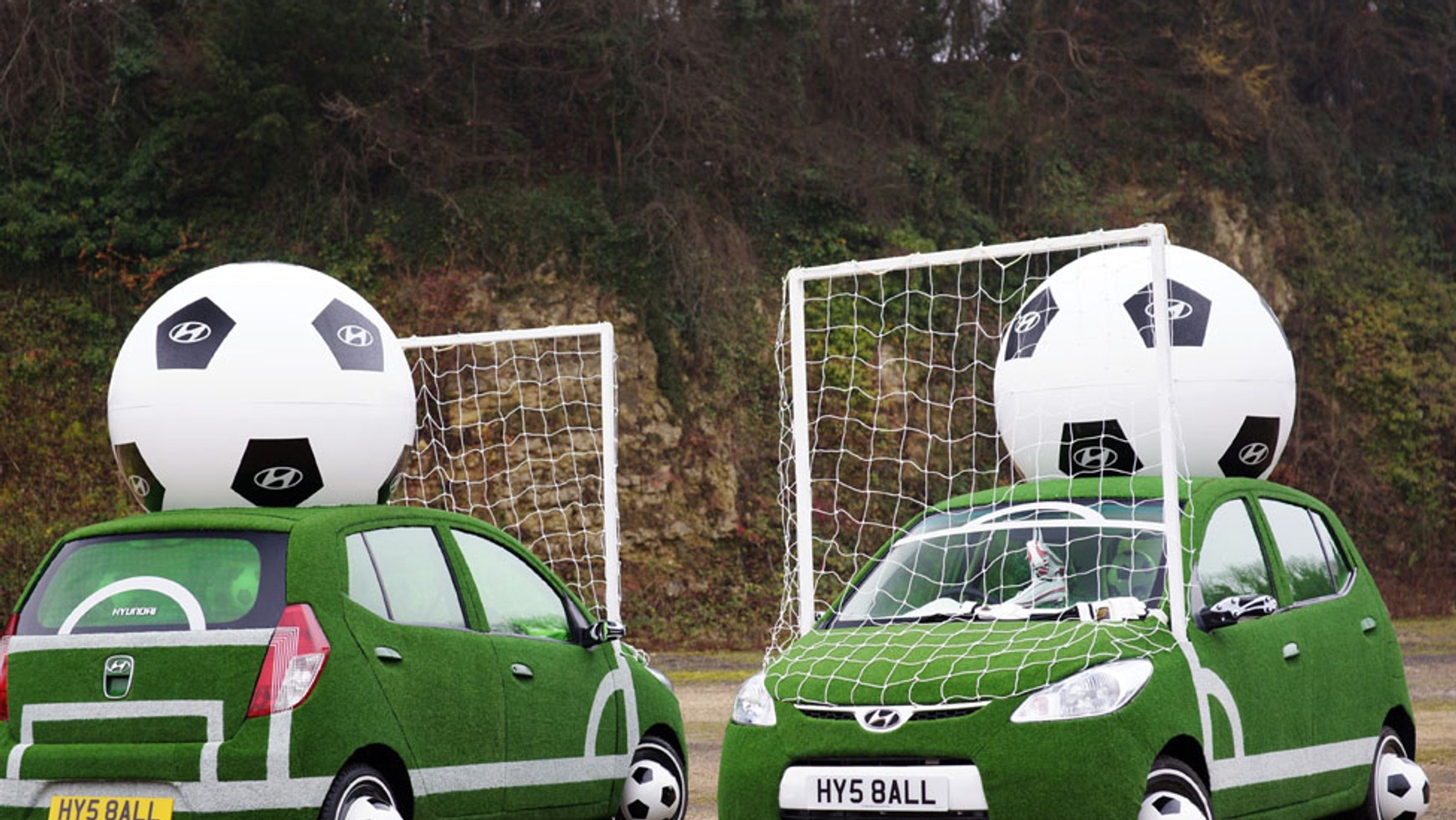 Piłkarskie mistrzostwa świata mają nie tylko oficjalne pojazdy. Angielski importer Hyundaia zbudował do celów marketingowych promujących tę imprezę dwa wyjątkowe auta. To Hyundaie i10, które zostały wcześniej rozbite podczas testów redakcyjnych jednego z brytyjskich magazynów motoryzacyjnych przez znanego dziennikarza Jeremy’ego Clarksona. Po modyfikacjach okazały się wyjątkowymi i niepowtarzalnymi egzemplarzami. Dach i nadwozie pokryte zostały 1,5-metrowym elementem nawierzchni boiska piłkarskiego. Koła, zamiast kołpaków, otrzymały połówki piłek, a na lusterkach pojawiły się buty piłkarskie. Każdy z tych dwóch egzemplarzy ma inne wnętrze, a ich motywy związane są z piłką nożną. Z okazji mistrzostw w wielu krajach pojawiły się w sprzedaży specjalne edycje samochodów Hyundaia z nadwoziem kremowym.