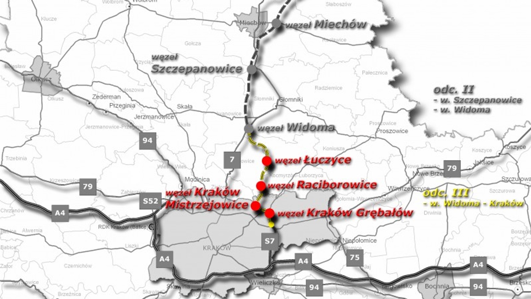 Prawie 56-km odcinek S7 od granicy woj. świętokrzyskiego do węzła Igołomska w Krakowie został podzielony na trzy części realizacyjne. Są to: odcinek od granicy województwa świętokrzyskiego do węzła Szczepanowice (bez węzła) - długość ok. 23 km; odcinek węzeł Szczepanowice (z węzłem) do węzła Widoma (z węzłem) - długości ok. 14 km oraz odcinek węzeł Widoma (bez węzła) do granic Krakowa (z włączeniem do węzła Igołomska) - długości ok. 18 km.