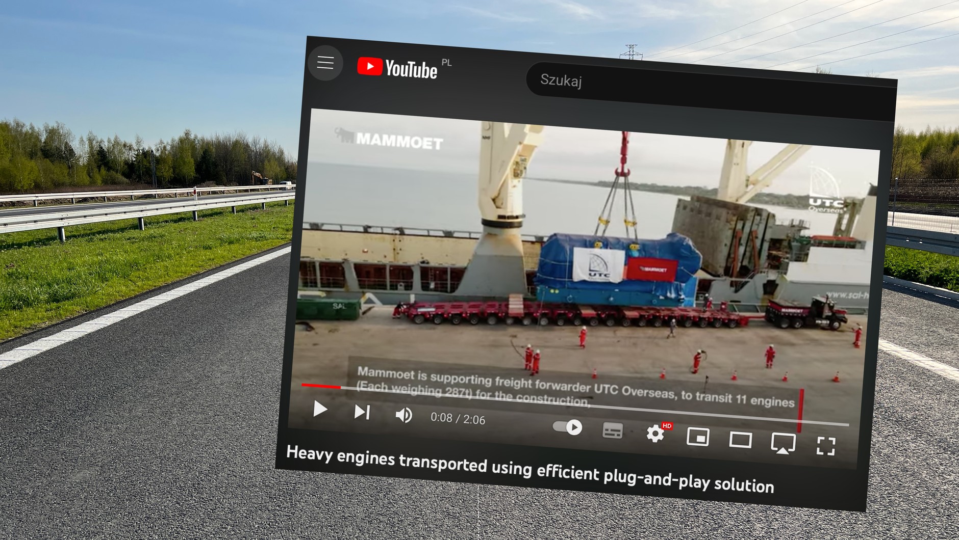 Do przewiezienia ciężkich silników wykorzystano konwencjonalne 20-osiowe platformy holowane przez ciągniki balastowe, które na części odcinków były wspomagane przez holowniki jadące z tyłu i pełniące funkcję tzw. pchacza. Kolumna musiała jechać alternatywnymi trasami, bo główna trasa nie dość, że prowadzi przez miasteczka, to na dodatek most, po którym musiałyby przejechać platformy z silnikami, miał niewystarczającą nośność. To m.in. dlatego transport przemieszczał się wąskimi, nieutwardzonymi drogami.