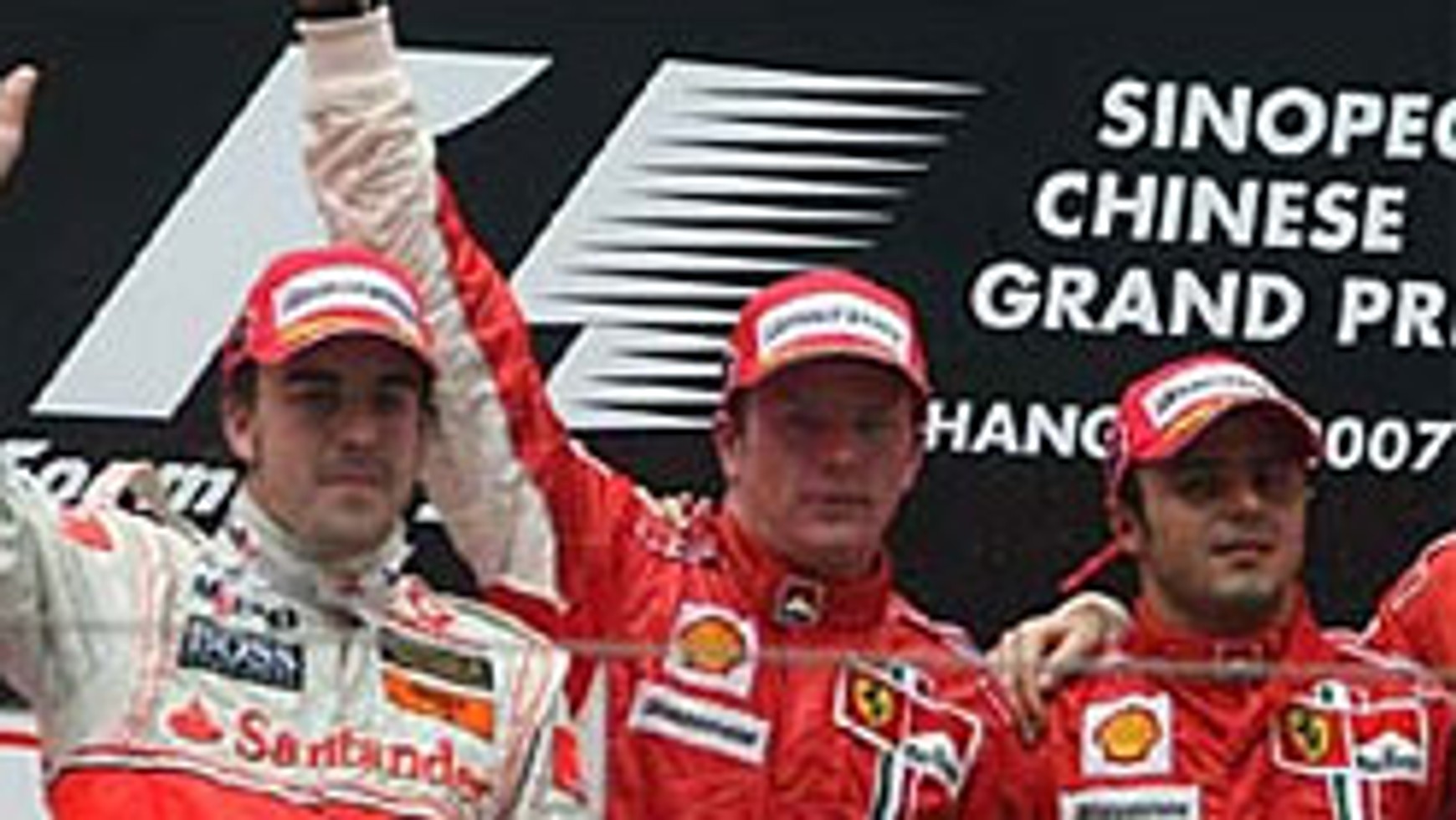 Zawodnicy na podium. Hymny: Fiński dla Kimi Raikkonena i włoski dla zespołu Ferrari. Leje się szampan...
