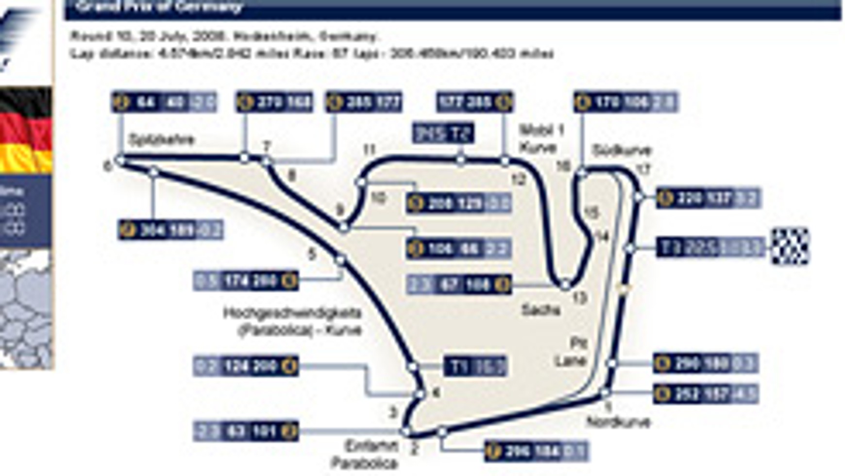 Hockenheimring Baden-Württemberg - informacje o torzeDługość toru4 574 mDługość wyścigu67 okr., 306.458 kmJakość nawierzchni asfaltowejrównaZużycie oponśrednie i dużePrzyczepnośćśrednia i dużaZużycie hamulcówśrednieProjektowana najwyższa prędkość315 km/hKierunek jazdyzgodnie z ruchem wskazówek zegaraLiczba lewych zakrętów7Liczba prawych zakrętów10