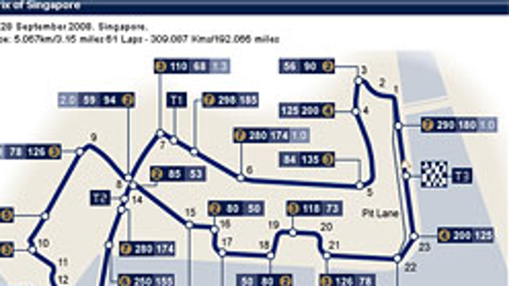 Pod wieloma względami tor w Singapurze przypomina również Monte Carlo. Elementy aerodynamiczne ustawiane będą na maksymalny docisk. Dzięki wielu zakrętom, które można pokonywać na drugim biegu, średnia prędkość maksymalna osiągnie tylko 170 km/h.