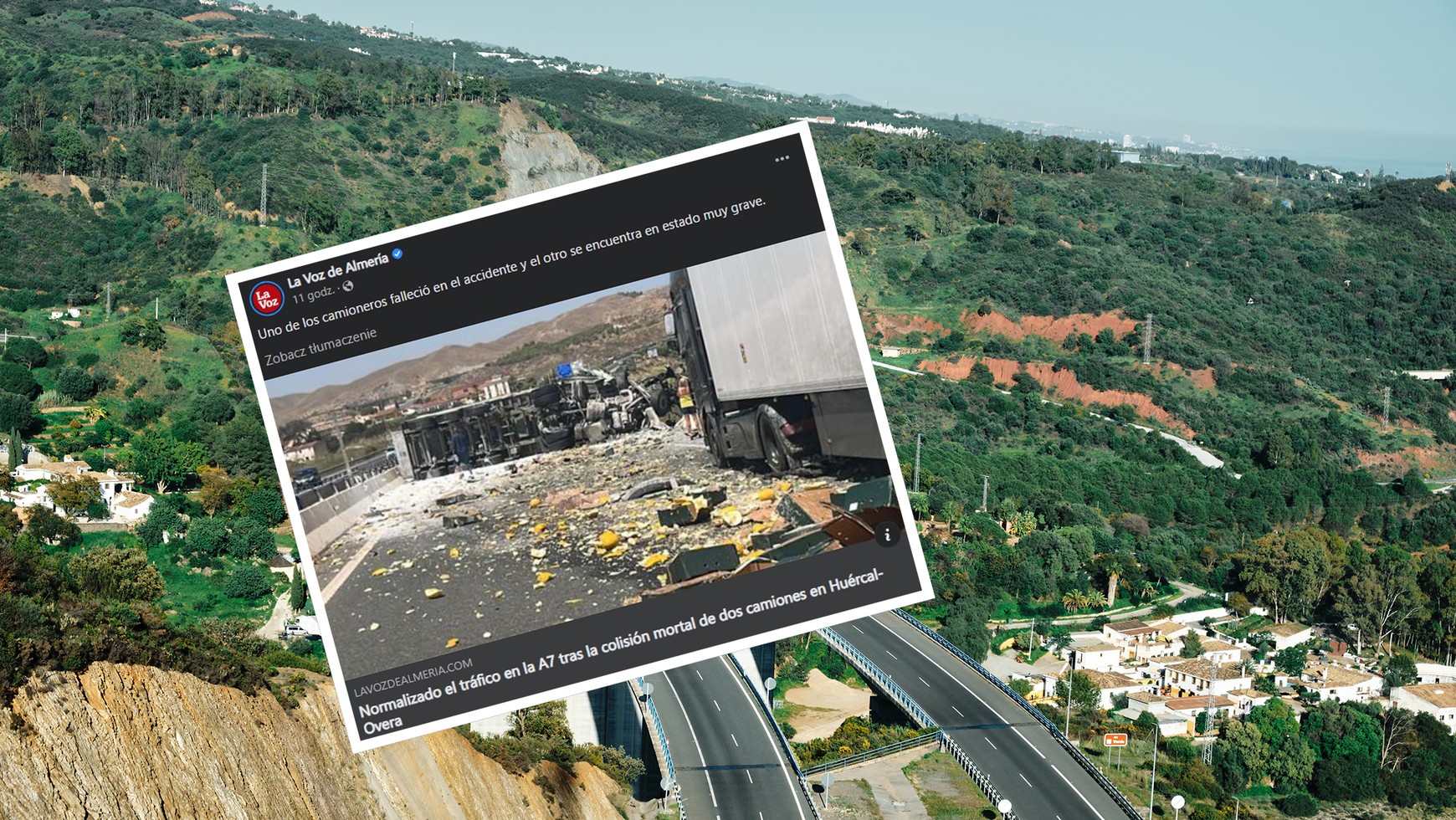 22 sierpnia ok. 14.00 na hiszpańskiej A-7 zderzyły się dwie ciężarówki — jedna z nich załadowana była gipsem, druga — melonami. W okolicy miejscowości Huércal-Overa na moście zatrzymała się chłodnia DAF XF. Pojazd, prowadzony przez 37-letniego Marokańczyka, najprawdopodobniej "złapał gumę". Kierowca wyszedł z kabiny, aby ocenić uszkodzenia. Ustawił zestaw przy krawędzi jezdni.