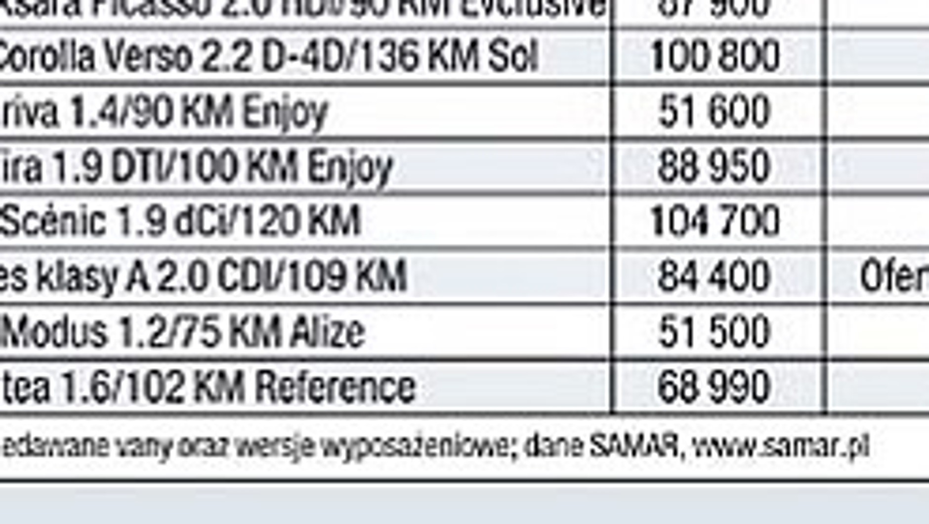 Wyprzedaż rocznika 2005 wpłynęła na obniżenie ceny auta o 5,5 tys. zł. Dodatkowym atutem jest roczny kredyt 50/50. Drugi japoński przedstawiciel - Toyota Corolla Verso - dostępny jest z podobną zniżką gotówkową 5,1 tys. zł. Jednak w tym przypadku korzyść dla klienta sięga 7,6 tys. zł, ponieważ samochód został dodatkowo wyposażony w alarm i czujniki parkowania o łącznej wartości 2,5 tys. zł.Najwyższy upust w tym zestawieniu oferowany jest przy zakupie Citroëna Xsary Picasso w najbogatszej wersji Exclusive - 30 tys. zł. Pokaźną zniżkę można uzyskać także przy zakupie Peugeota 307 SW w wersji Trendy, Renault Scénica w bardzo dobrze wyposażonej odmianie Luxe Privilége oraz Seata Altei. Dla Mercedesa klasy A producent reklamował upust dochodzący do 20 tys. zł, ale podlegał on indywidualnym negocjacjom. Nowością w gamie jest wersja StarLine z lepszym wyposażeniem seryjnym oraz dostępny wraz z nią kredyt 50/50. Obydwaj reprezentanci Opla wyprodukowani w ubiegłym roku są tańsi o 3 tys. zł.Więcej: http://www.samar.pl