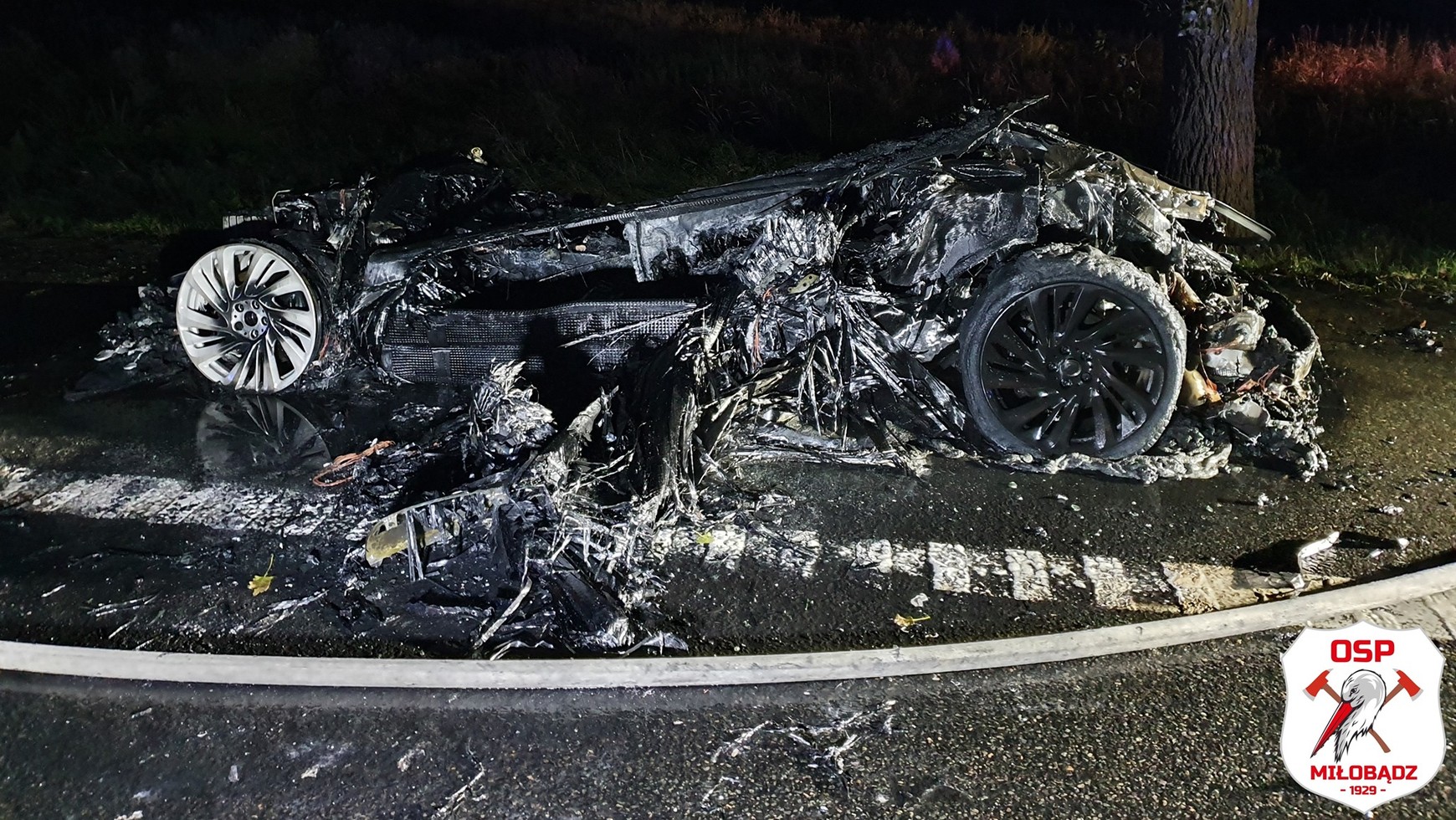 BMW i8 całkowicie spłonęło (nowe kosztuje znacznie ponad 600 tys. zł). W zasadzie nie da się poznać co to za auto, ani gdzie ma przód, a gdzie tył. Strażacy po opanowaniu pożaru przez wiele godzin skupili się na schładzaniu wraku pojazdu. To ważne, ponieważ hybrydy i auta elektryczne jest nie tylko trudno ugasić (może to być nawet niemożliwe), ale również mogą one ponownie zająć się ogniem nawet po długim czasie. Strażacy z OSP Miłobądz i JRG Tczew wykazali się fachowością.