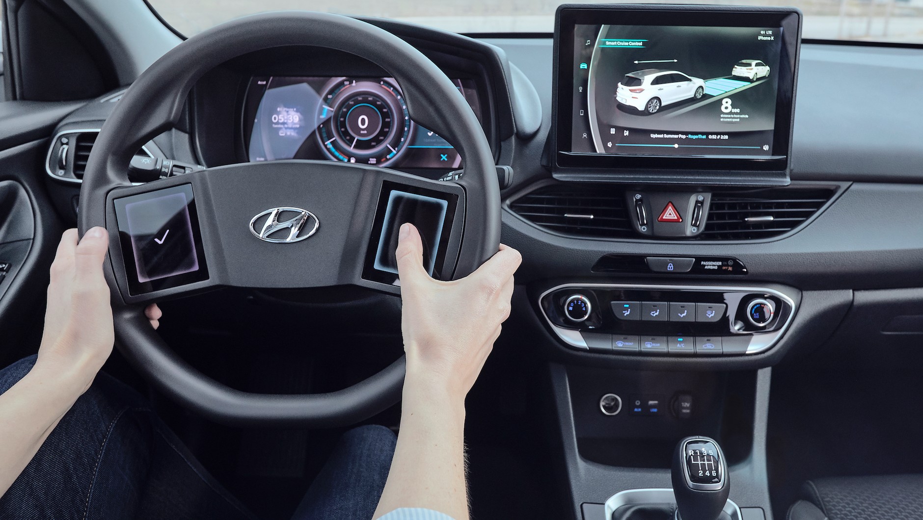 Nowe rozwiązanie pokazano w zwykłym aucie, czyli Hyundai'u i30. Po bokach prototypowej kierownicy umieszczono dwa wyświetlacza z możliwością konfiguracji układu ikon do wymagań użytkownika. Dwa moduły siłowników mają umożliwiać reakcję nawet na lekki dotyk.