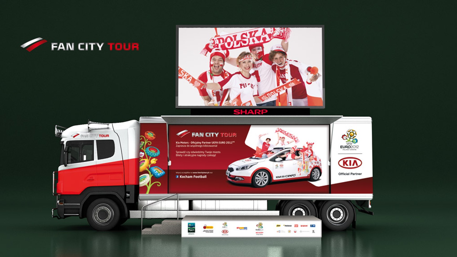Fan City Tour - Nie trzeba jechać do miast gospodarzy na stadion lub do oficjalnych stref kibica, by przeżyć niezapomniane piłkarskie emocje podczas Euro. Dzięki inicjatywie sponsorów (Kia Motors Polska, Biedronka, Carlsberg, RTV Euro AGD, Sharp i TVP) 100 polskich miast odwiedzą mobilne strefy kibica. Każda z nich składa się z ciężarówki wyposażonej w telebim, na którym będą transmitowane mecze. Ponadto zorganizowane będą liczne inne atrakcje, w tym konkursy (m.in. piłkarskie kalambury, kwizy na temat polskiej reprezentacji) i katering. Dokładna lista miast i terminów odwiedzin dostępna na stronie: www.fancitytour.pl.
