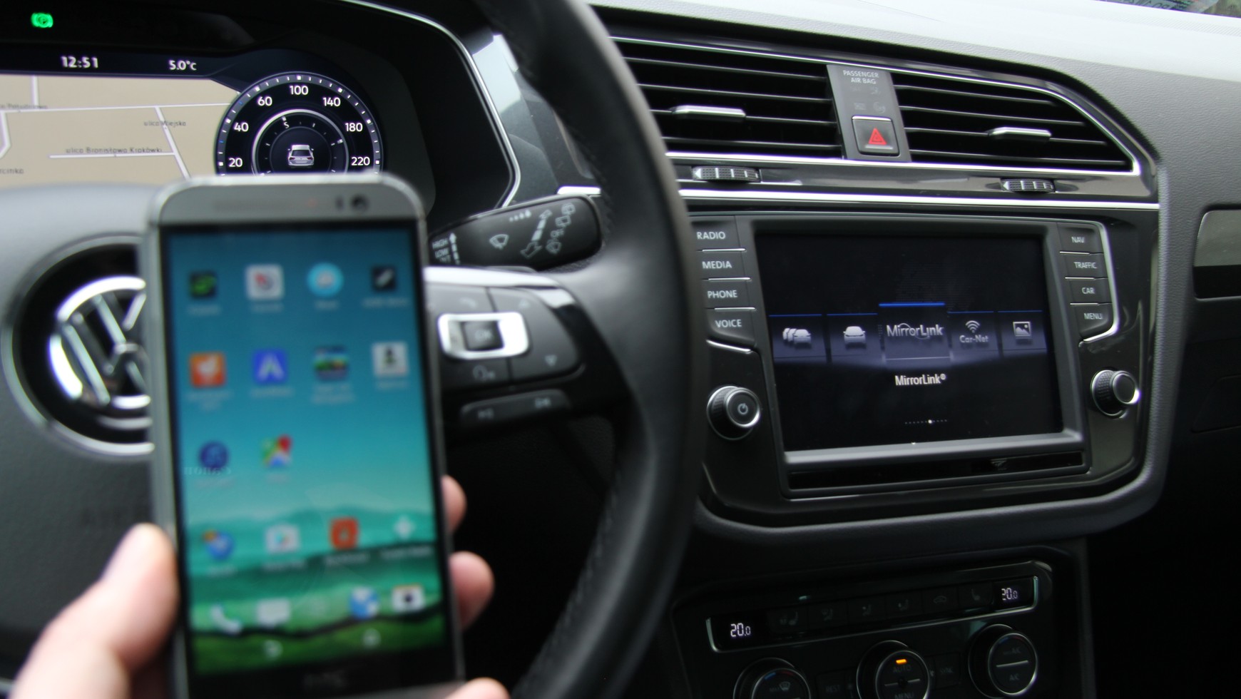 Idea rozwiązania jest prosta jak drut. Na ekranie w samochodzie mamy zobaczyć wybrane aplikacje z telefonu i wygodnie nimi sterować korzystając z komend głosowych, przycisków na kierownicy i radiu oraz ekranu dotykowego. Wystarczy tylko podłączyć odpowiedni telefon przewodem USB do radia i uruchomić funkcję MirrorLnk. Tyle teorii. W praktyce wyszło trochę gorzej.