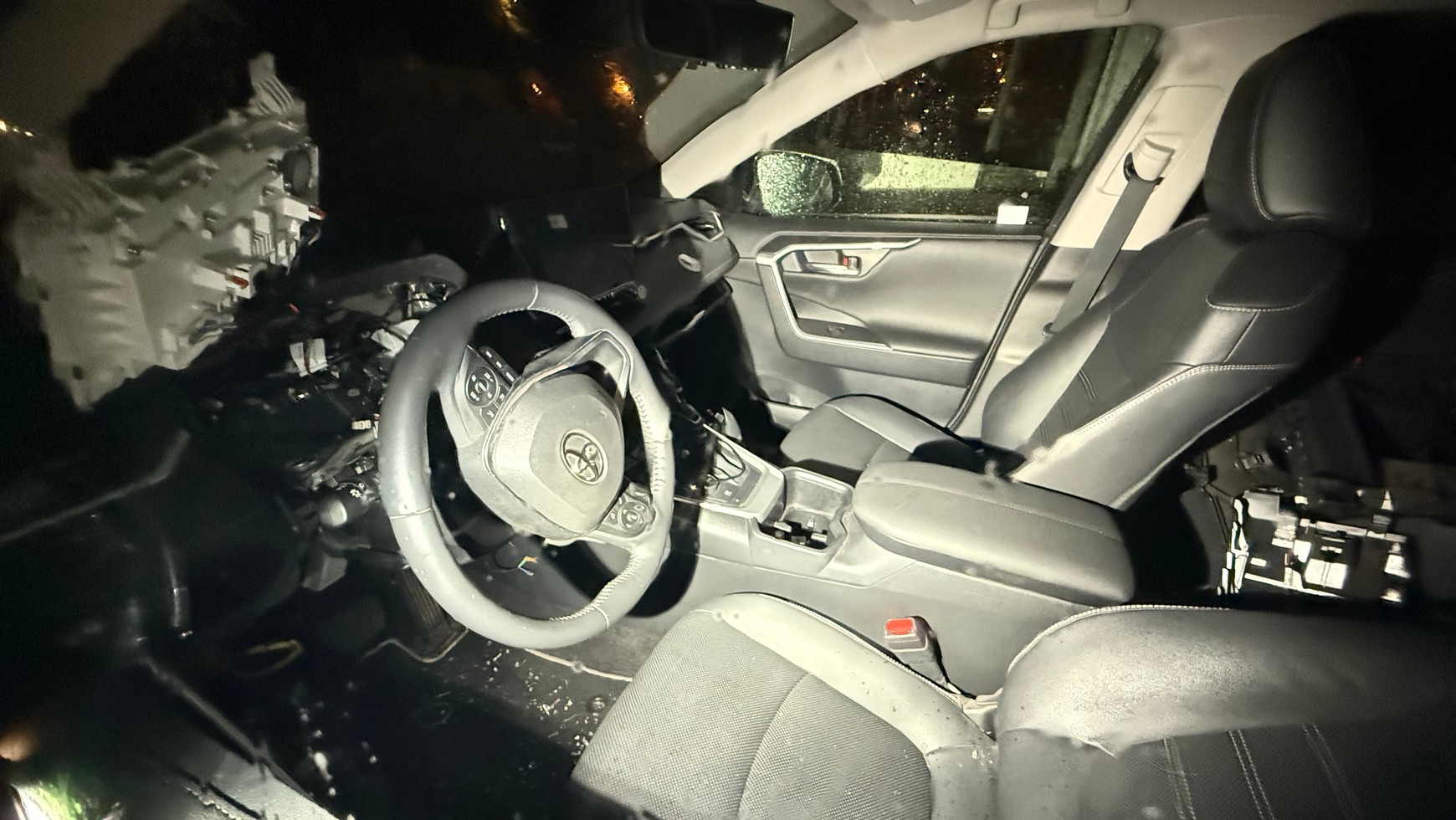 Toyota Pawła wyglądała w środku – z punktu widzenia przeciętnego użytkownika samochodu – jak po wybuchu bomby. Wybebeszone osłony pod kierownicą, wiązki i pojedyncze przewody na wierzchu, wyciągnięty licznik, wyrwany panel klimatyzacji. Położony fotel kierowcy – prawdopodobnie po to, by złodziej miał swobodę ruchów. Wrażenie zniszczenia dopełniły odłamki szkła – wybito najmniejszą szybkę, pewnie po to, by ręcznie dostać się do środka. Po co komu elementy wnętrza takiego samochodu, kto to kupi?