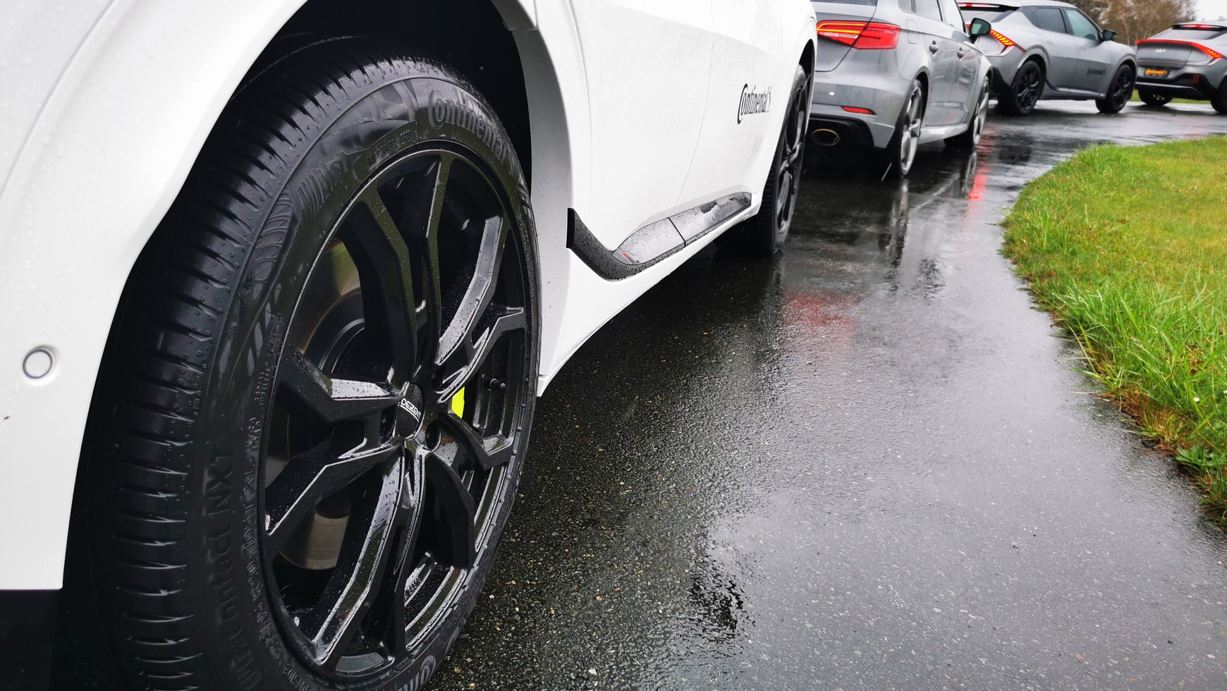 Na torze Contidrom nieopodal Hanoweru wsiadamy do samochodów testowych obutych w nowe opony UltraContact NXT. Pada deszcz, ale to chwilowo bez znaczenia, testy i tak mają odbywać się na mokrym, sztucznie zraszanym, krętym torze. Samochody to auta o dużej masie i wybitnych osiągach: napęd Kii EV6 GT ma moc 585 KM i 740 Nm momentu obrotowego – jakieś trzy-cztery razy więcej niż ma pod maską przeciętny samochód jeżdżący po polskich drogach. Kia EV6 GT osiąga setkę w 3,5 sekundy.