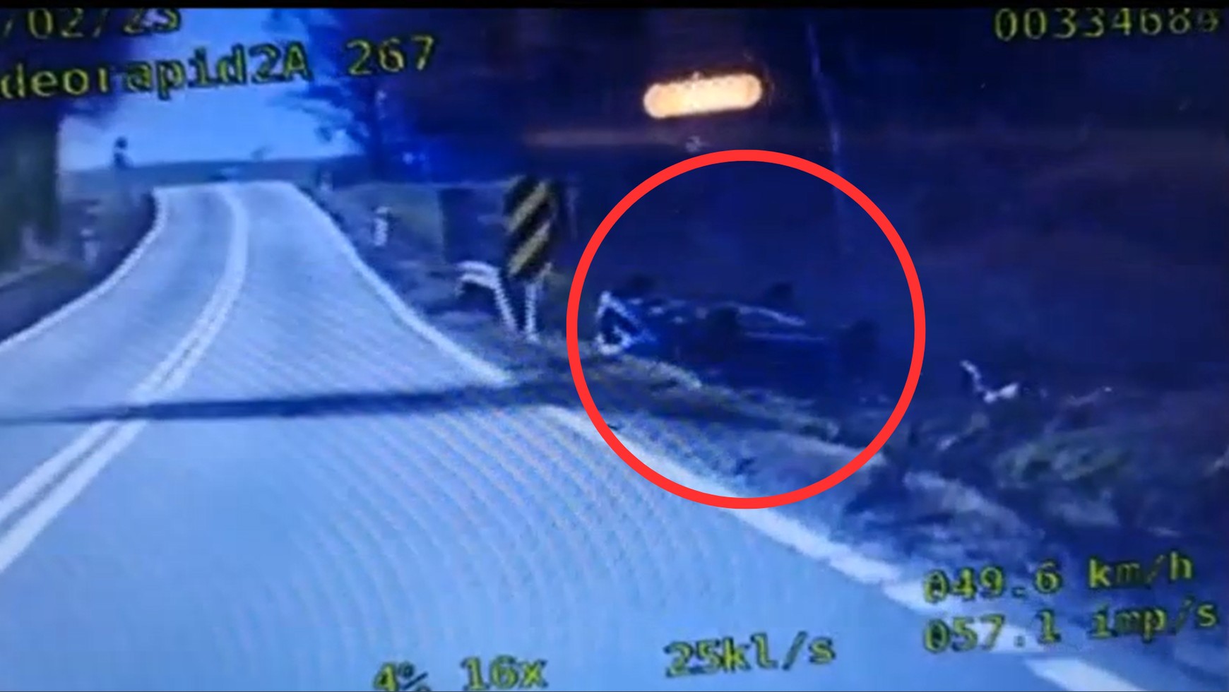 Auto na jednym z zakrętów wpadło w poślizg, przewróciło się na bok i ostatecznie wylądowało na dachu w przydrożnym rowie. Bardzo groźnie wyglądające zdarzenie nagrała kamera zamontowana w radiowozie.