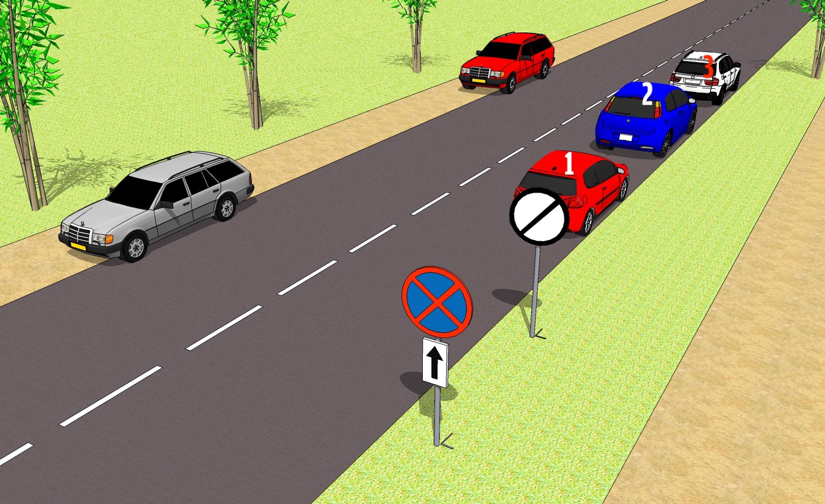 W sytuacji przedstawionej na rysunku pojazdy 1, 2 i 3 zaparkowane są przy prawej krawędzi jezdni: