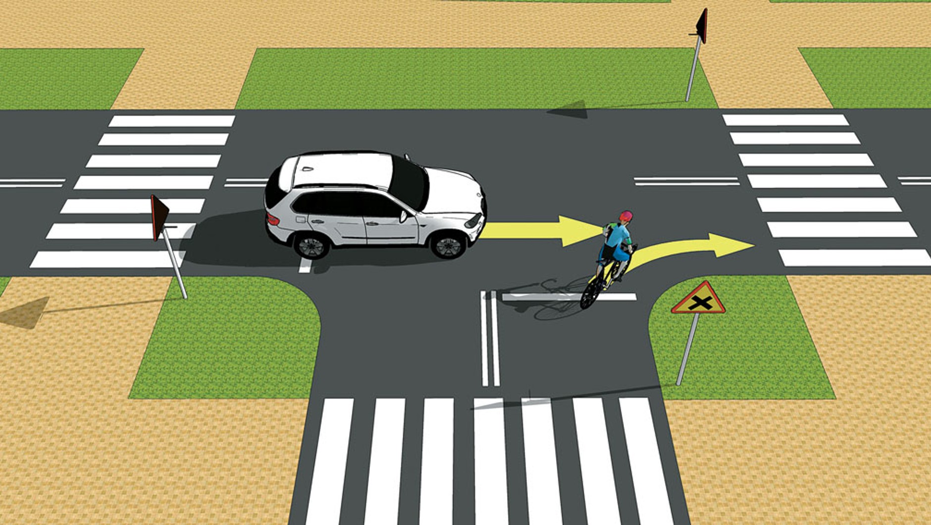 Korzystanie z pasa dla autobusów przez kierujących rowerami, o ile znaki nie wskazują inaczej, jest zabronione. Chodnik, co do zasady, przeznaczony jest dla pieszych. Droga dla pieszych jest dostępna dla rowerzystów jedynie w szczególnych sytuacjach, m.in. wtedy, gdy dozwolona prędkość na jezdni jest wyższa niż 50 km/h. Pokazana na rysunku sytuacja jest bardzo specyficzna, jednak istnieje w rzeczywistości – m.in. na moście Poniatowskiego w Warszawie. W takich warunkach, choć nie jest to komfortowe dla nikogo, rowerzyści powinni poruszać się tak, jak to pokazano na rysunku.