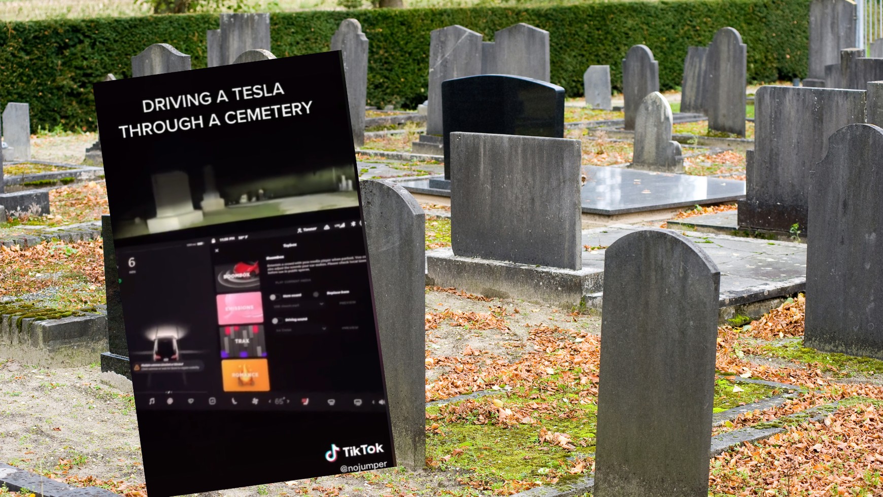Na filmiku widzimy jadącą przez cmentarz Teslę. Gdy przejeżdża obok nagrobków, od czasu do czasu na wyświetlaczu w samochodzie można zobaczyć zarys postaci wchodzącej w kadr. Tymczasem przez szybę auta widzimy, że w tym miejscu nikogo nie ma.