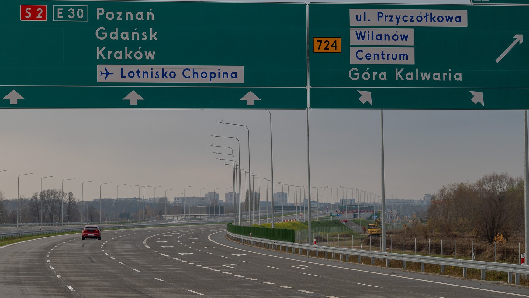 Plan na drodze S2: z dziennikarzem rozmawia (na wprost kamery) Piotr Zaremba, prezes zarządu ElectroMobility PolandGDDKiA