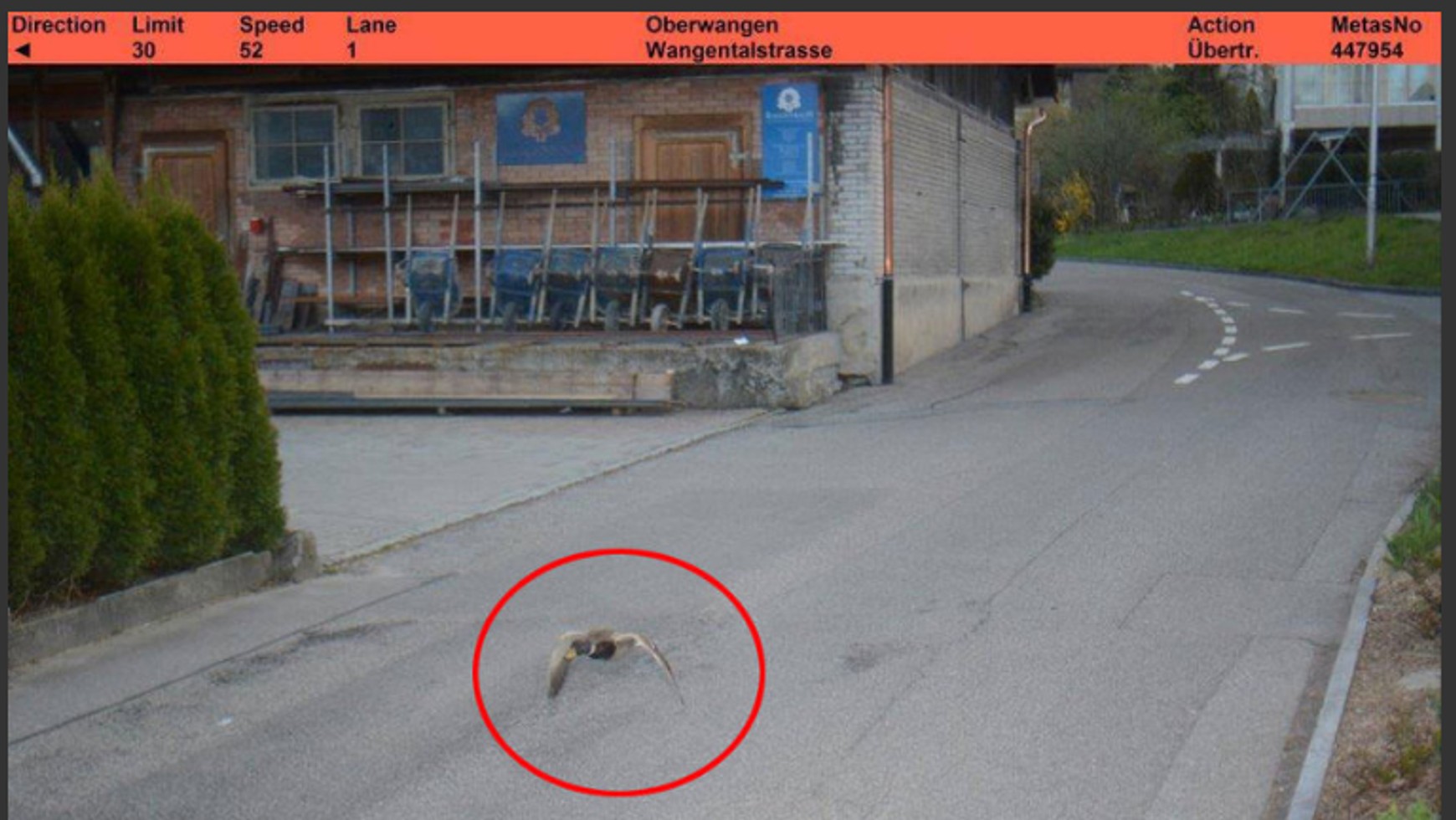 Szwajcarskie służby obsługujące krajowy system fotoradarów opublikowały zdjęcie zarejestrowanego wykroczenia, a dokładnie przekroczenia prędkości na drodze lokalnej w kantonie berneńskim. Nie byłoby w tym nic dziwnego, jednak w tym przypadku piratem okazała się dzika kaczka, która przeleciała przed fotoradarem z prędkością 52 km/h. Komentarz służb w tym wypadku ograniczył się do krótkiego pytania: „Komu mamy wysłać mandat?”
