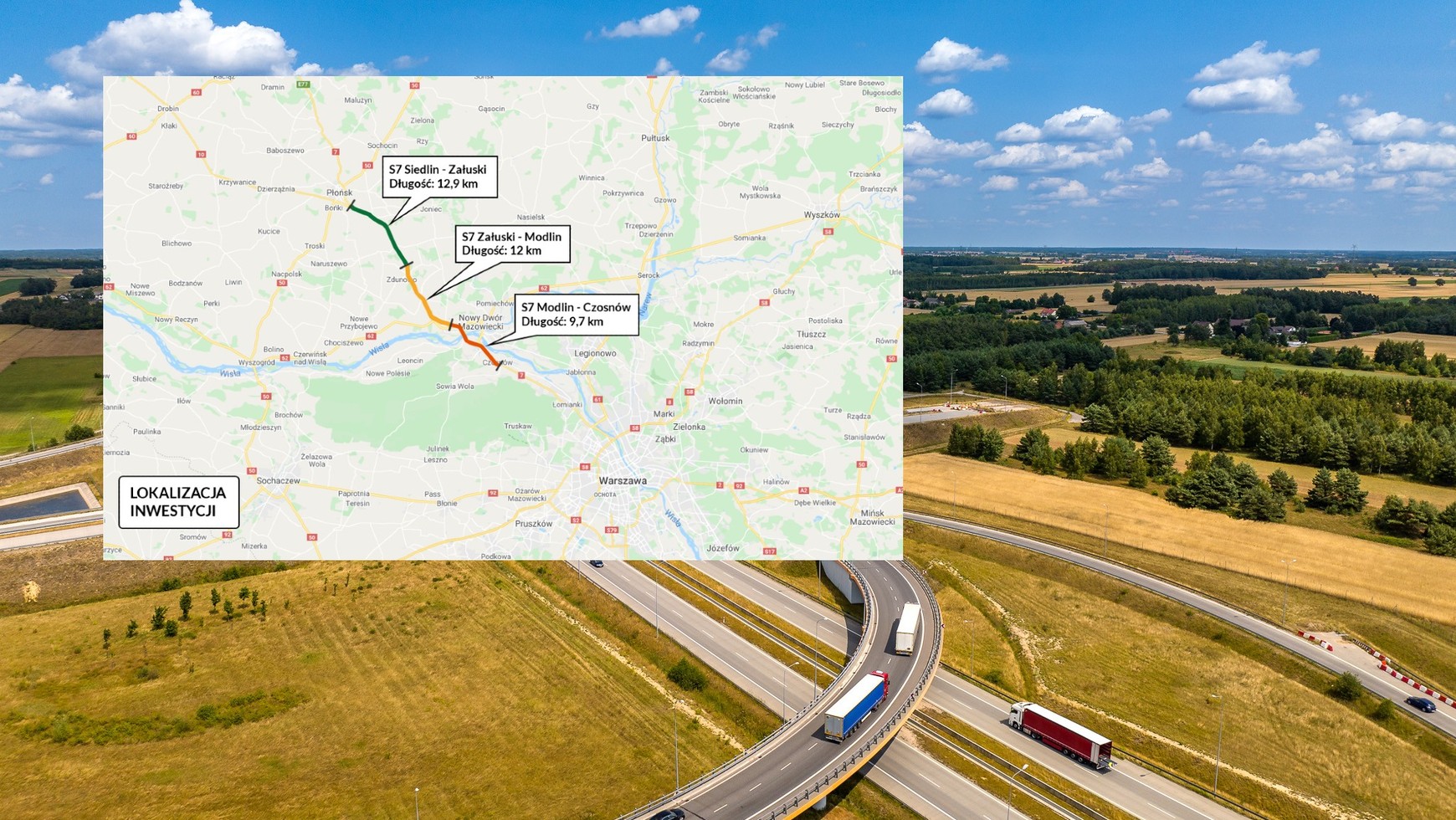 Projektowana droga S7 na odcinku Płońsk - Czosnów w większości pokrywa się z istniejącym śladem. Trasa rozpoczyna się na połączeniu z ekspresową obwodnicą Płońska na 300. kilometrze, za istniejącym węzłem Siedlin, gdzie krzyżują się drogi krajowe nr 7 i nr 10. Kończy się w miejscowości Czosnów, łącząc się z projektowanym w ramach odrębnego zamówienia węzłem Czosnów. Inwestycja obejmuje również nowy przebieg drogi krajowej nr 62, zlokalizowanej w rejonie węzła Ostrzykowizna w ciągu projektowanej drogi S7. Możecie zobaczyć ją na poniższej mapie GDDKiA: