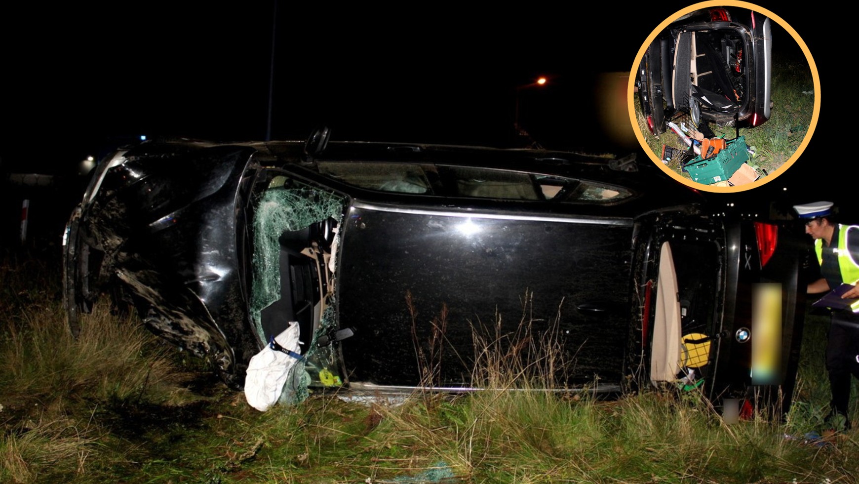 Policjanci piotrkowskiej drogówki na miejscu zastali dosłownie zmasakrowane BMW. Mieszkaniec województwa łódzkiego, wjeżdżając na rondo, nie dostosował prędkości do warunków i uderzył w wyspę centralną. Pęd był na tyle duży, że samochód przeleciał nad rondem i uderzył w latarnię. Koziołkując dalej, zatrzymał się na lewym boku w przydrożnym rowie.