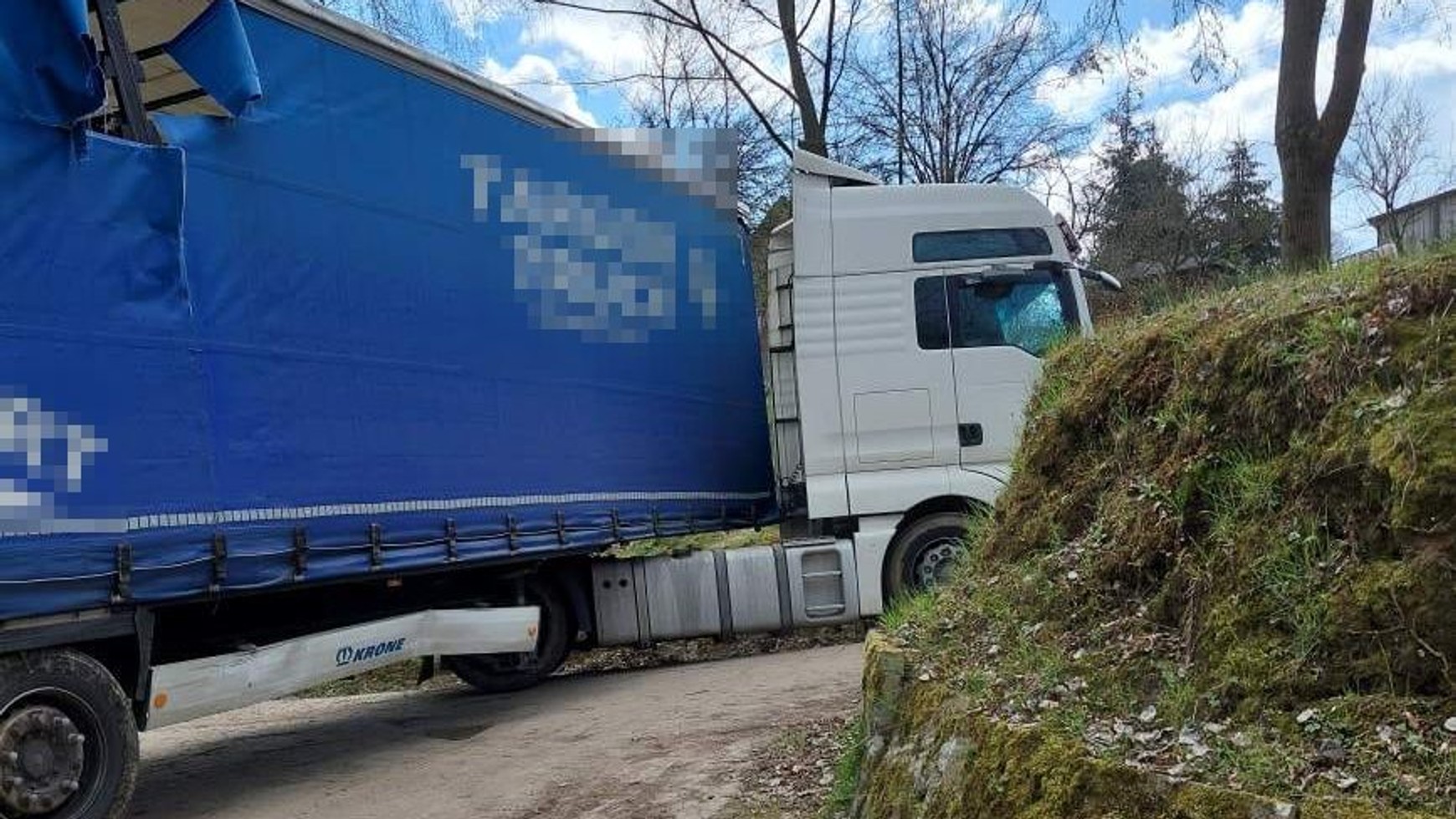 "Kierując się nawigacją, w Rogalowie wjechał na drogę gruntową, tym samym ignorując znak drogowy informujący o zakazie wjazdu dla samochodów ciężarowych o dopuszczalnej masie całkowitej przekraczającej 3,5 tony" - poinformowała podkomisarz Ewa Rejn–Kozak z Komedy Powiatowej Policji w Puławach.